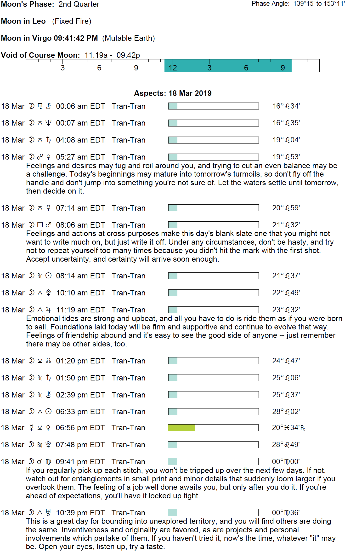 Planet Color Key: The longer the bar, the slower the aspecting planet and the longer the duration of the planet’s transit.