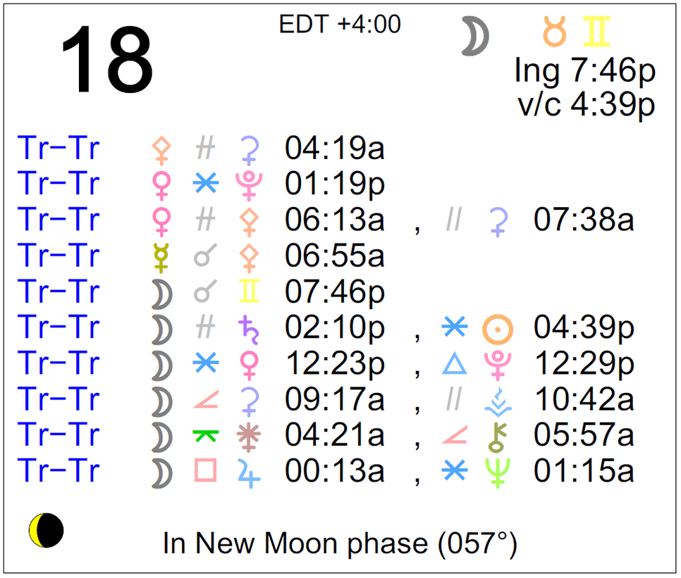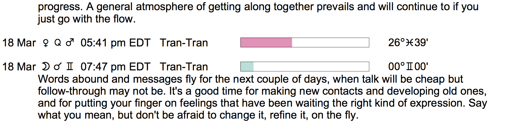 Planet Color Key: The longer the bar, the slower the aspecting planet, and the longer the duration of the planet’s transit.