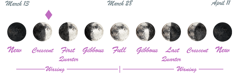 - The New Moon occurred on the 13th in the sign of Pisces, and the First Quarter Moon will happen on March 21st.
