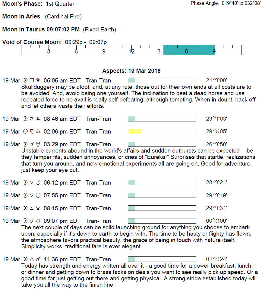 Planet Color Key: The longer the bar, the slower the aspecting planet and the longer the duration of the planet’s transit.