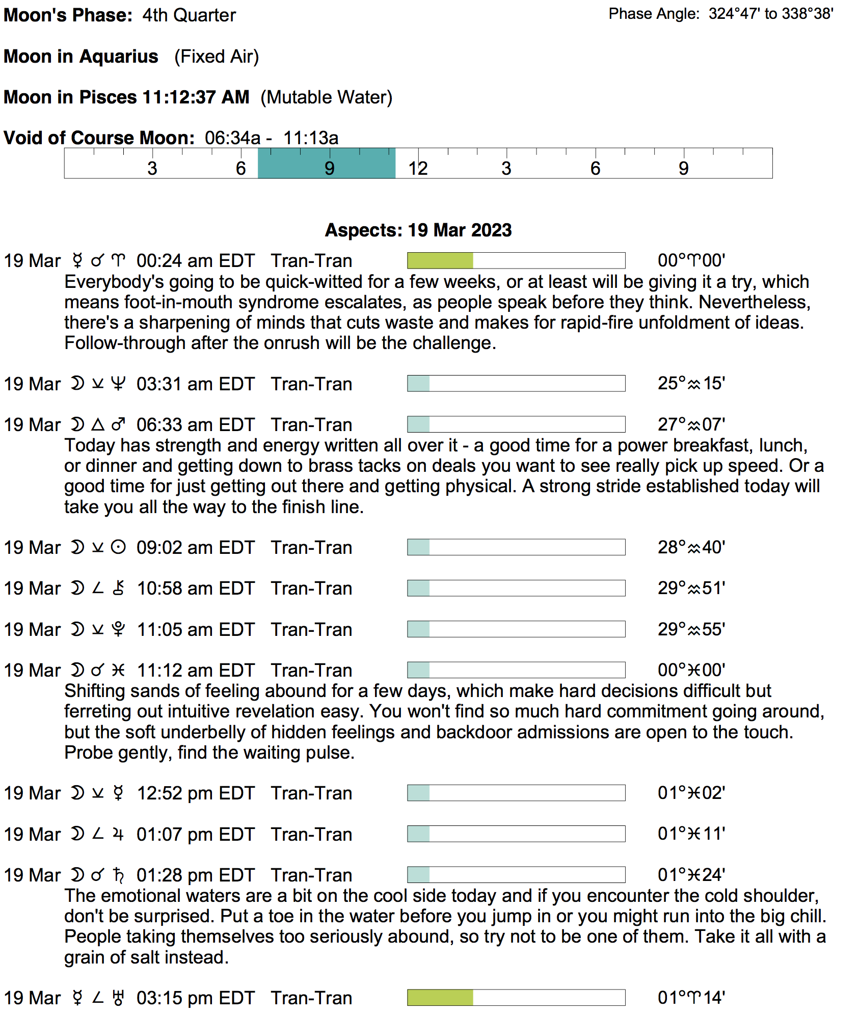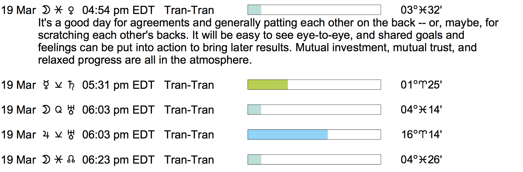 Planet Color Key: The longer the bar, the slower the aspecting planet, and the longer the duration of the planet’s transit.