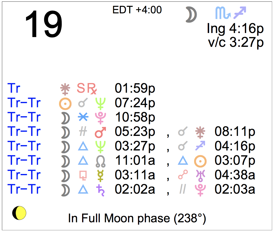 Planet Color Key: The longer the bar, the slower the aspecting planet, and the longer the duration of the planet’s transit.