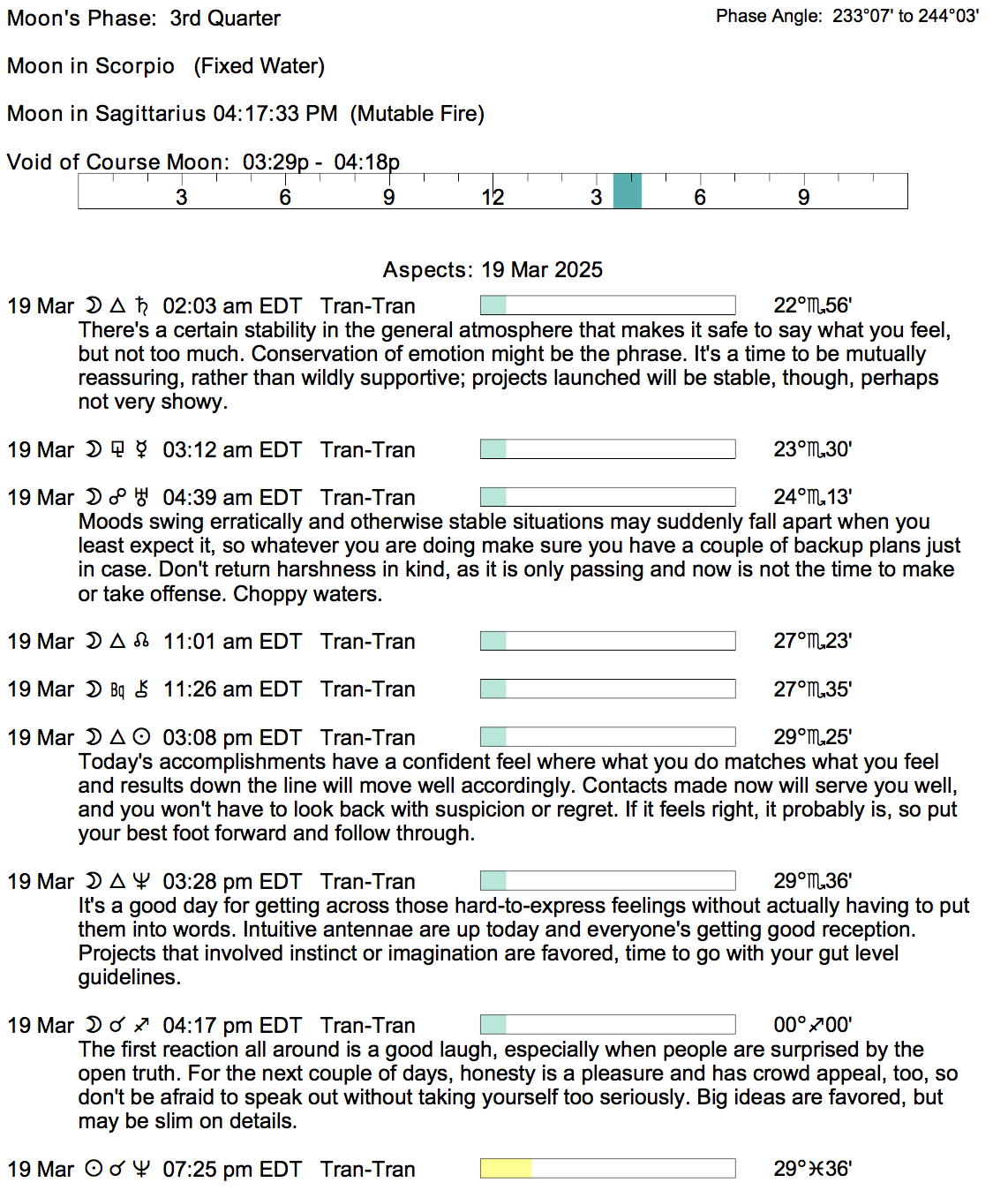 - A void Moon period occurs from 3:27 PM to 4:16 PM today.