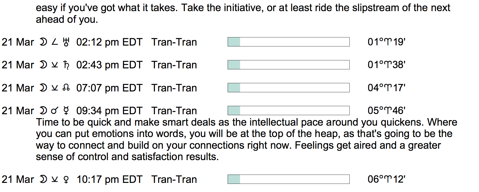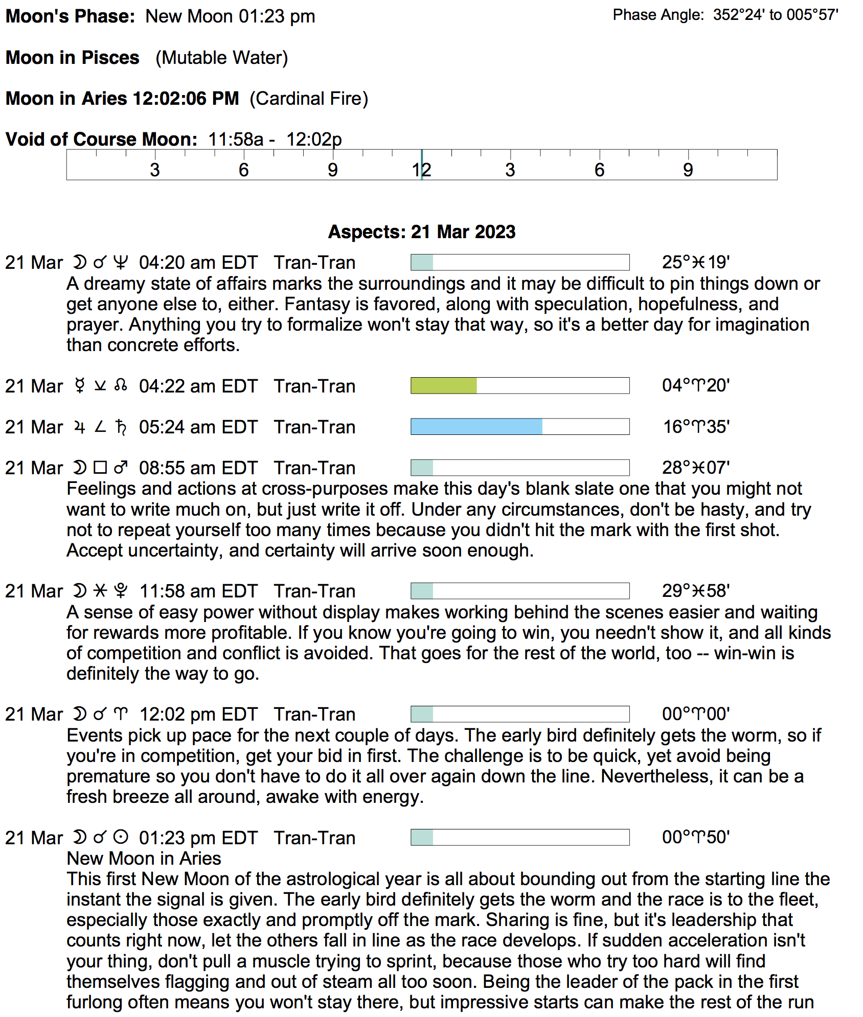 Planet Color Key: The longer the bar, the slower the aspecting planet, and the longer the duration of the planet’s transit.