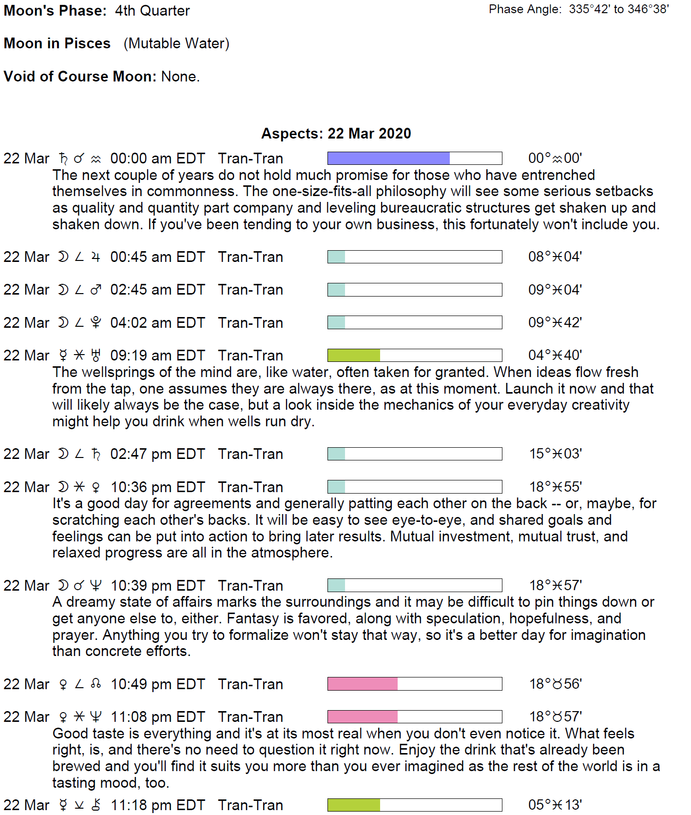 Planet Color Key: The longer the bar, the slower the aspecting planet and the longer the duration of the planet’s transit.