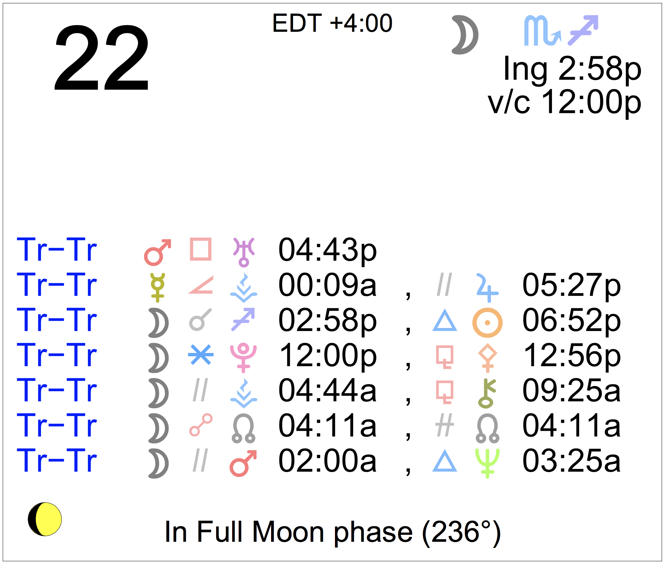 Planet Color Key: The longer the bar, the slower the aspecting planet, and the longer the duration of the planet’s transit.