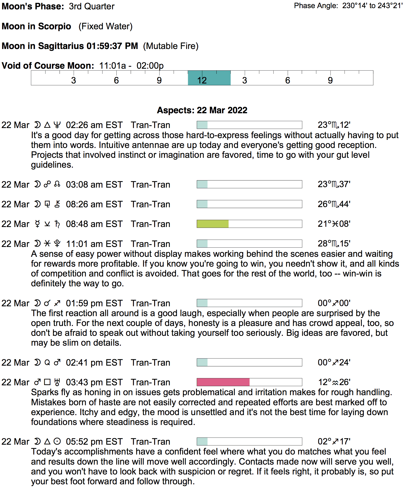 - A void Moon period occurs from 12:00 PM to 2:58 PM today.