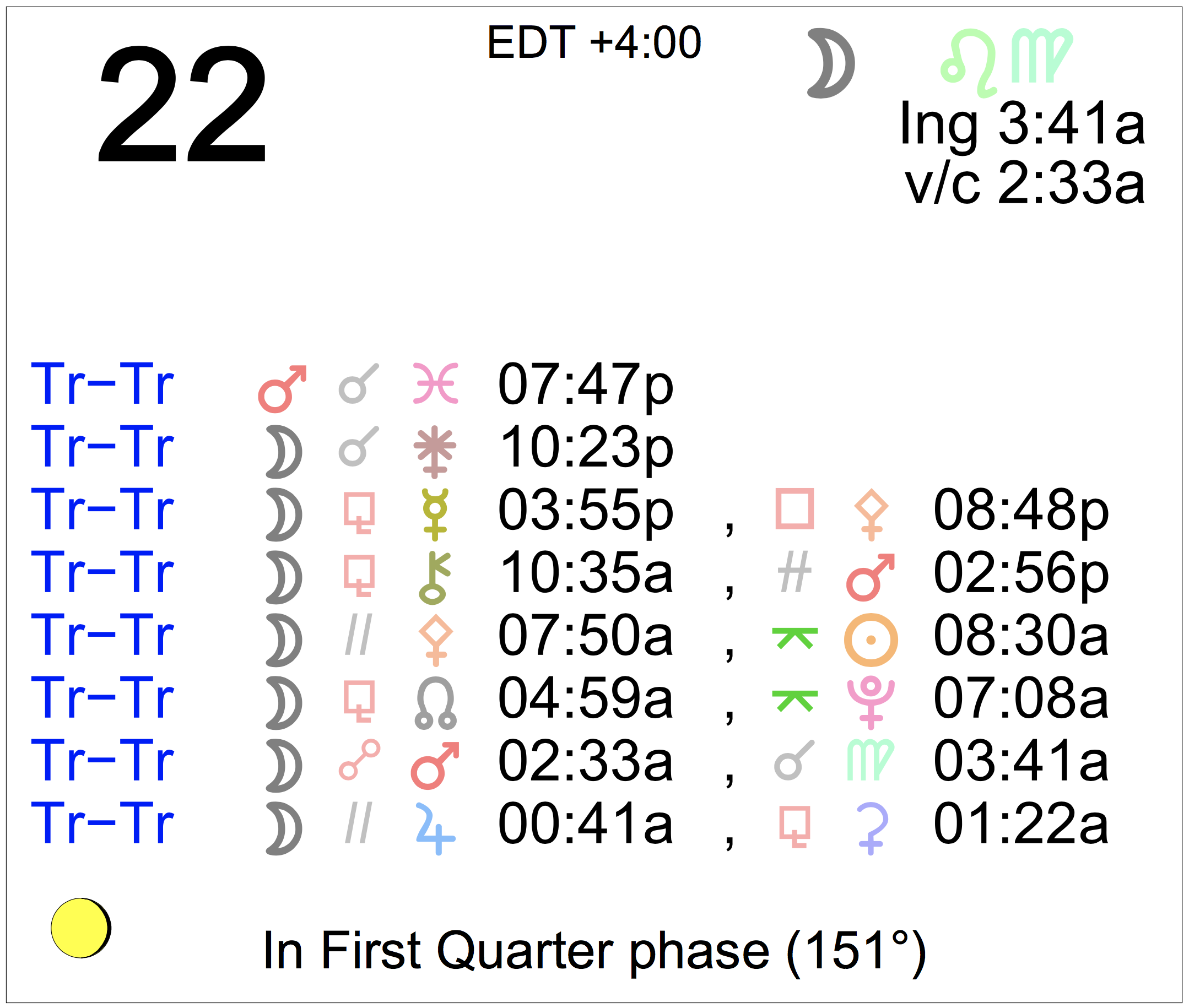 - A void Moon period occurs from 2:33 AM to 3:41 AM today.