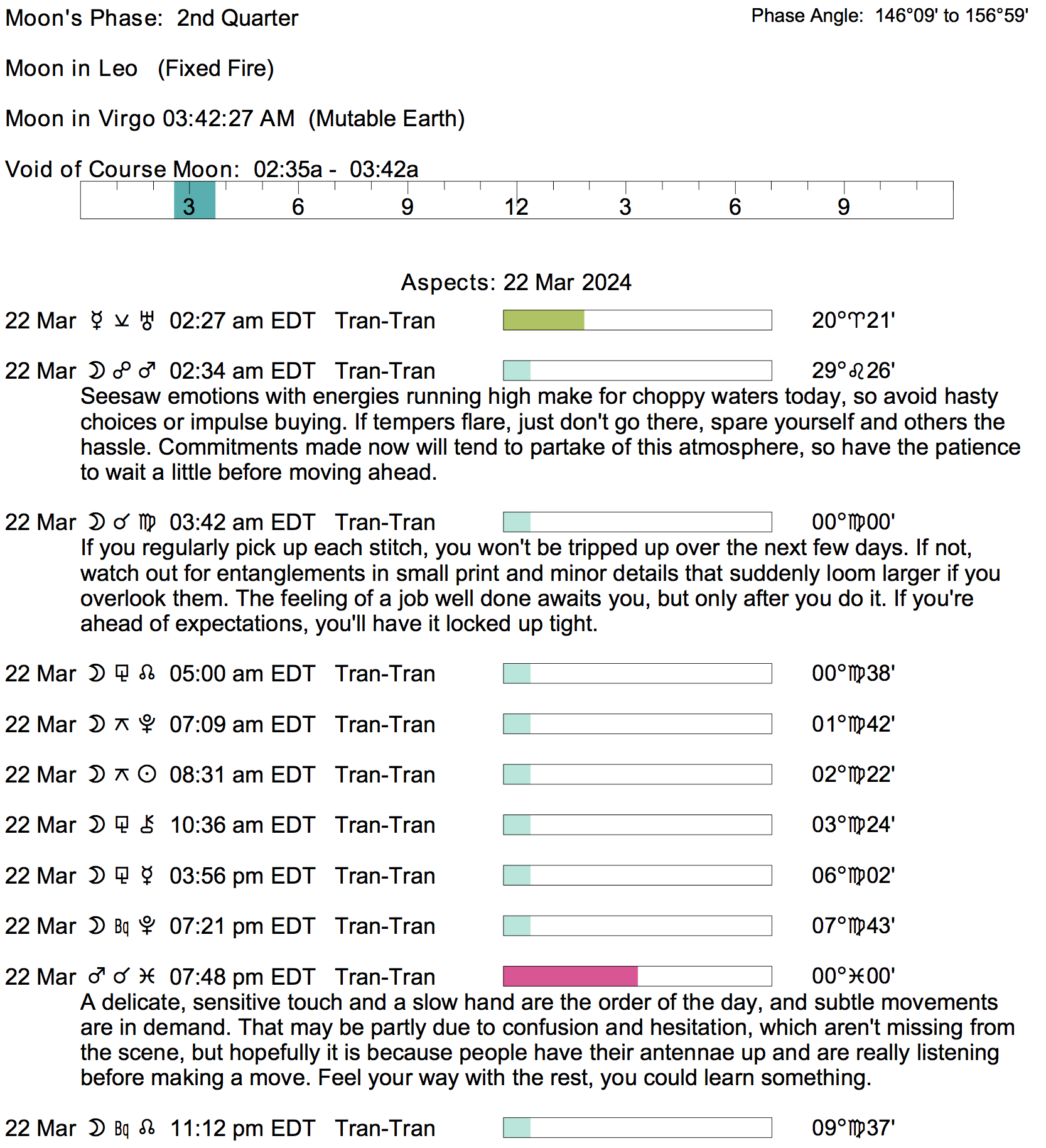 Planet Color Key: The longer the bar, the slower the aspecting planet, and the longer the duration of the planet’s transit.