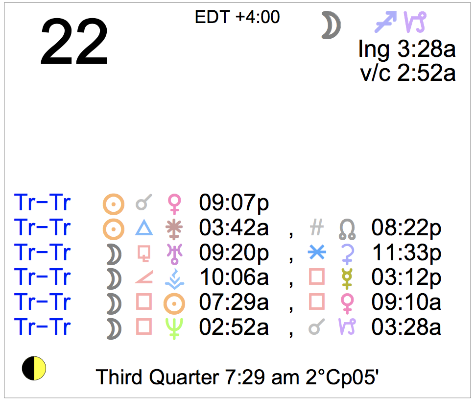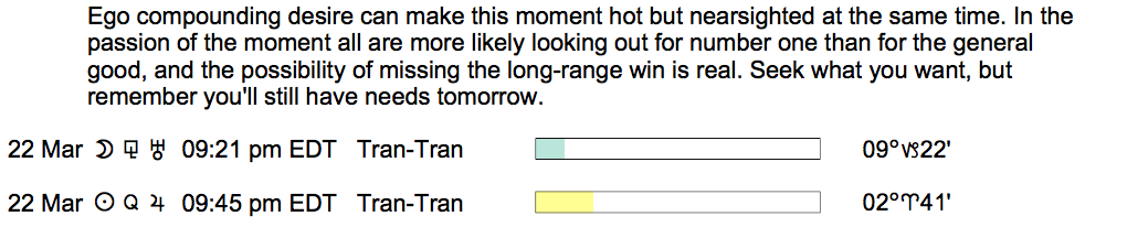 Planet Color Key: The longer the bar, the slower the aspecting planet, and the longer the duration of the planet’s transit.