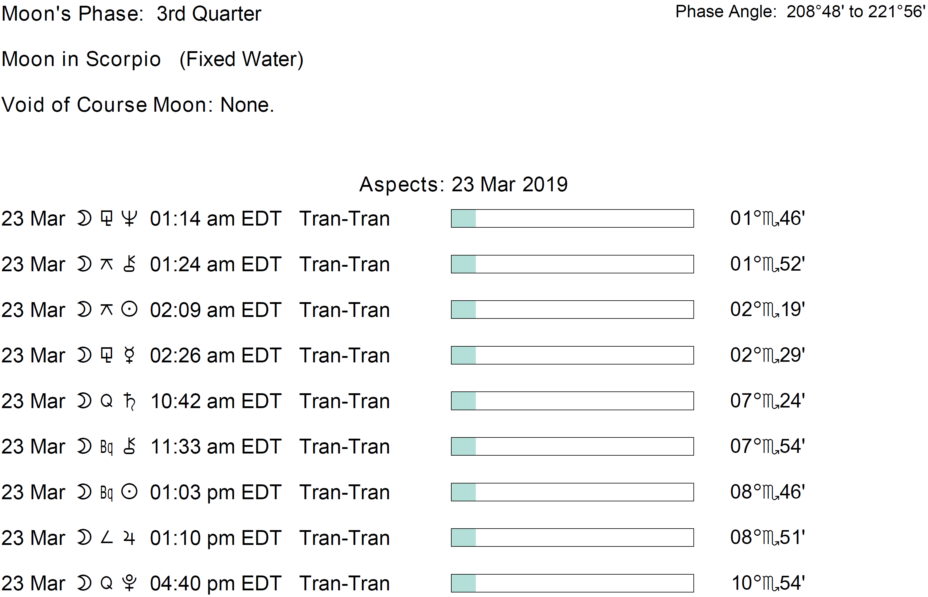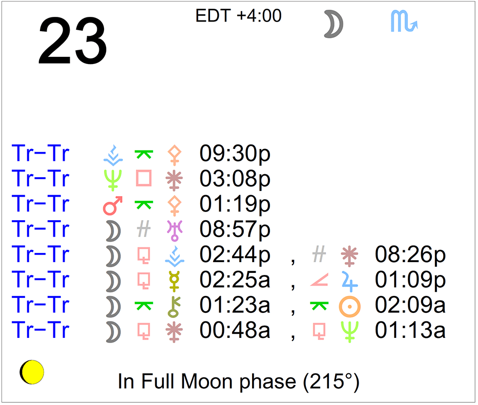 Planet Color Key: The longer the bar, the slower the aspecting planet and the longer the duration of the planet’s transit.