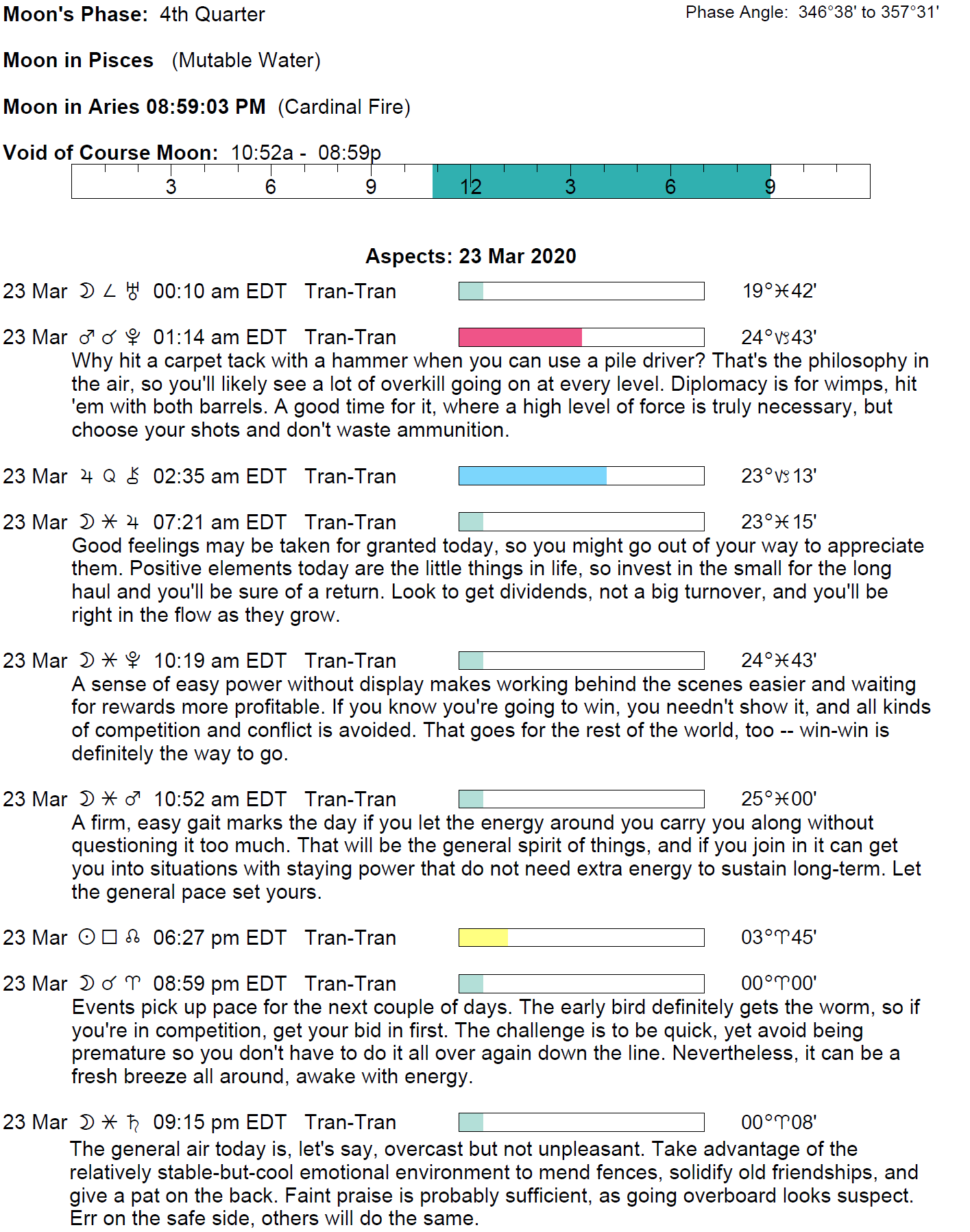 Planet Color Key: The longer the bar, the slower the aspecting planet and the longer the duration of the planet’s transit.