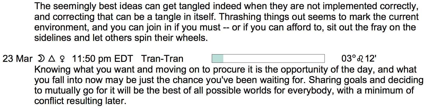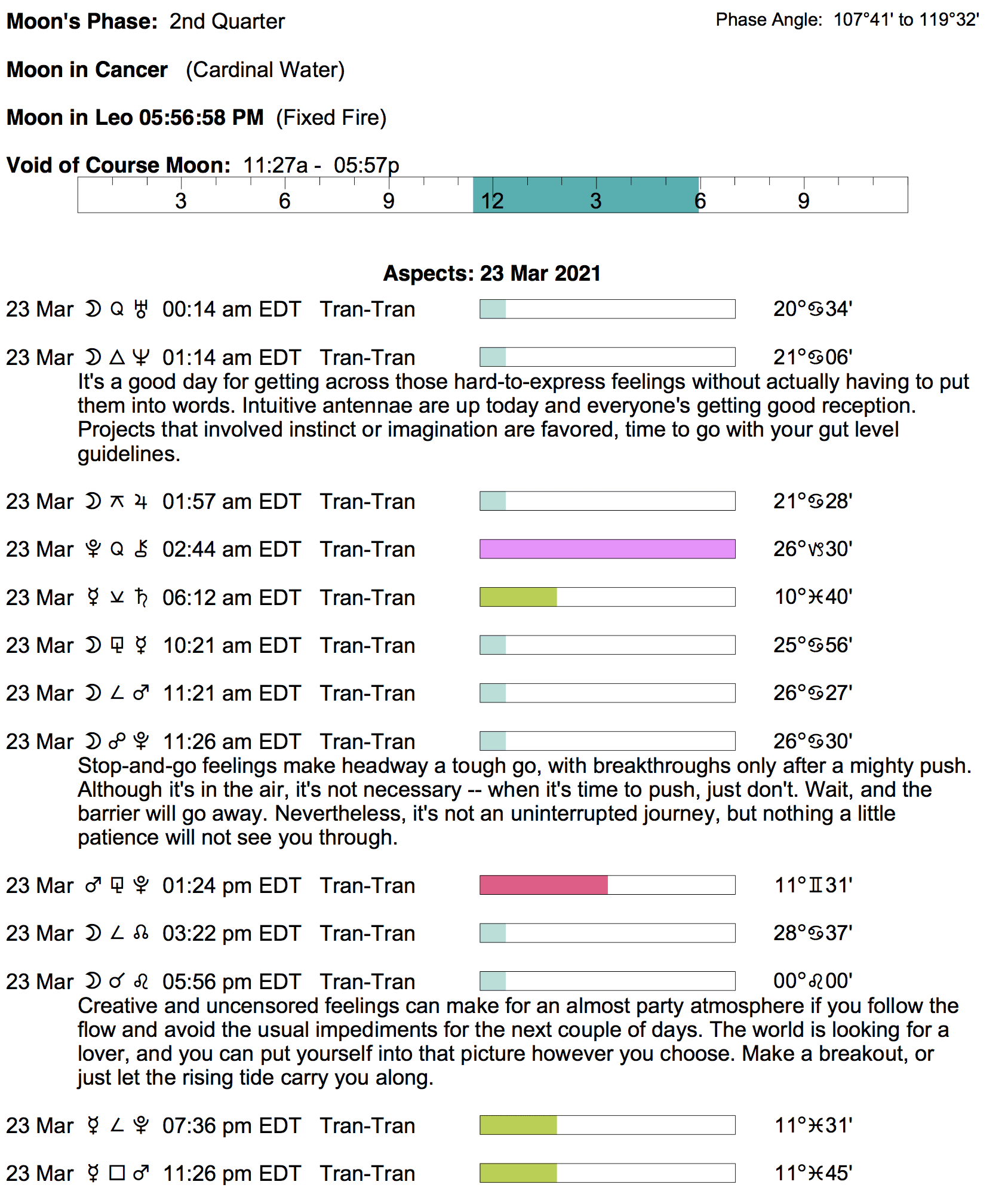 Planet Color Key: The longer the bar, the slower the aspecting planet, and the longer the duration of the planet’s transit.