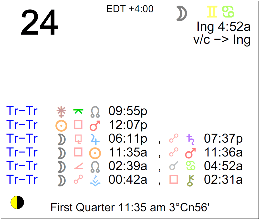 The Moon is in Gemini until 4:52 AM, after which the Moon is in Cancer.