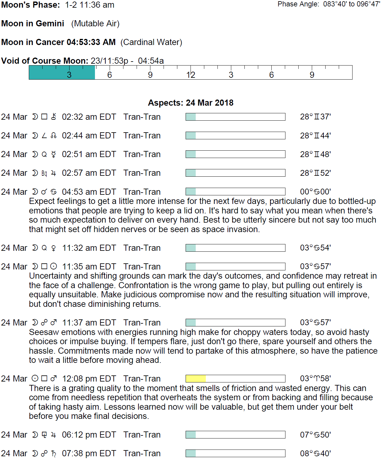Planet Color Key: The longer the bar, the slower the aspecting planet and the longer the duration of the planet’s transit.
