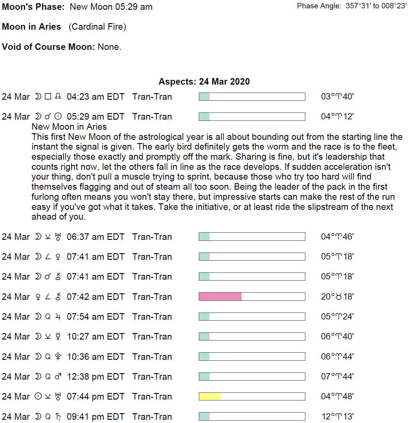 Planet Color Key: The longer the bar, the slower the aspecting planet and the longer the duration of the planet’s transit.