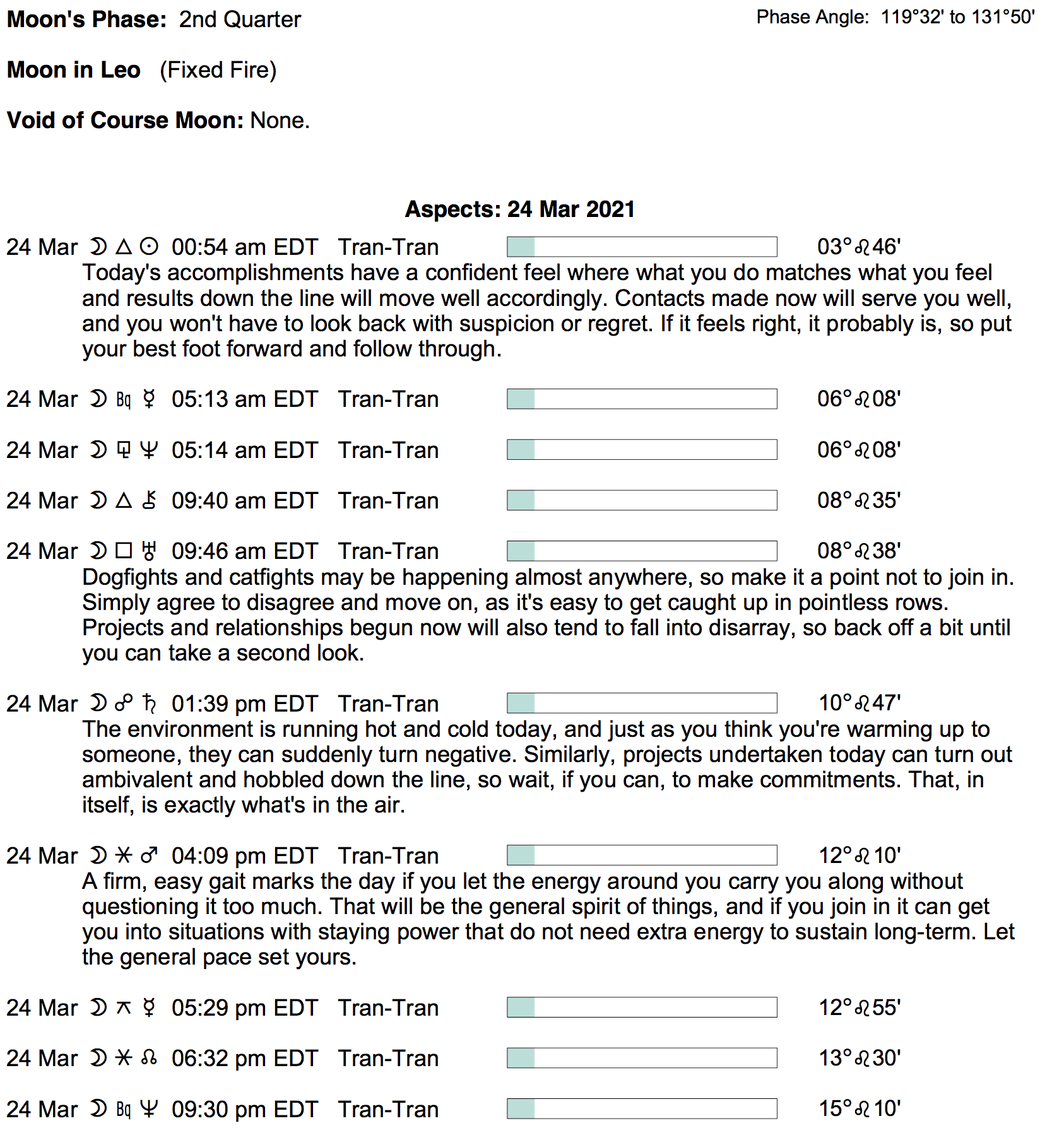 Planet Color Key: The longer the bar, the slower the aspecting planet, and the longer the duration of the planet’s transit.