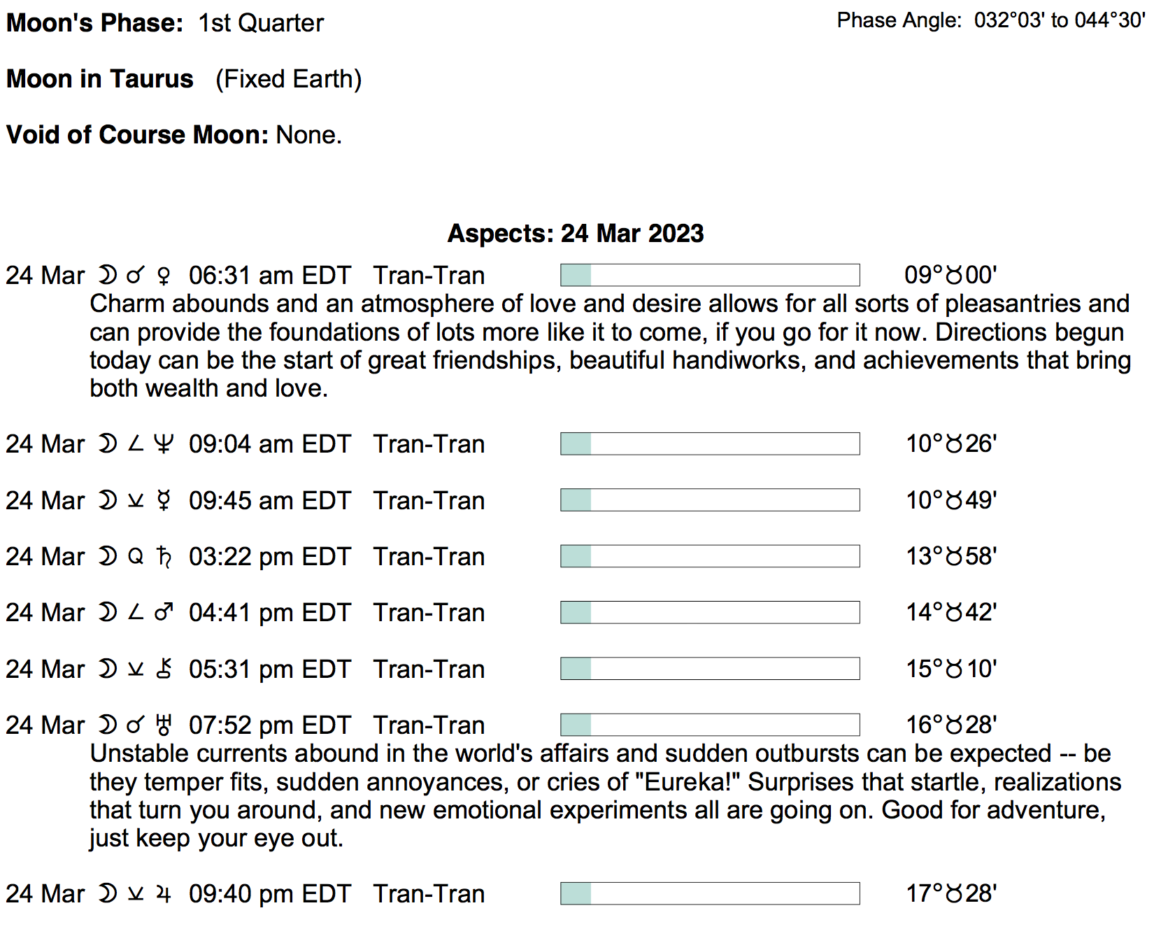 Planet Color Key: The longer the bar, the slower the aspecting planet, and the longer the duration of the planet’s transit.
