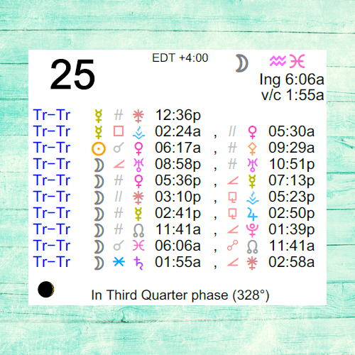 Again today, you may be seeing your money, attachments, and business matters in a new way, dear Pisces. It’s a good time to let go of those things that you no longer need as the energy of today is pleasantly detached! Desires can be illuminated today with the Sun conjunct retrograde Venus in your solar second house. Watch for impulsive moves, but do listen to what your impulses are telling you. Try to avoid making firm plans today and tomorrow with a New Moon set to occur on the 27th. The Moon enters your sign in the morning, and previously buried emotions tend to rise to the surface, demanding attention. It’s a good time to wrap up personal plans.