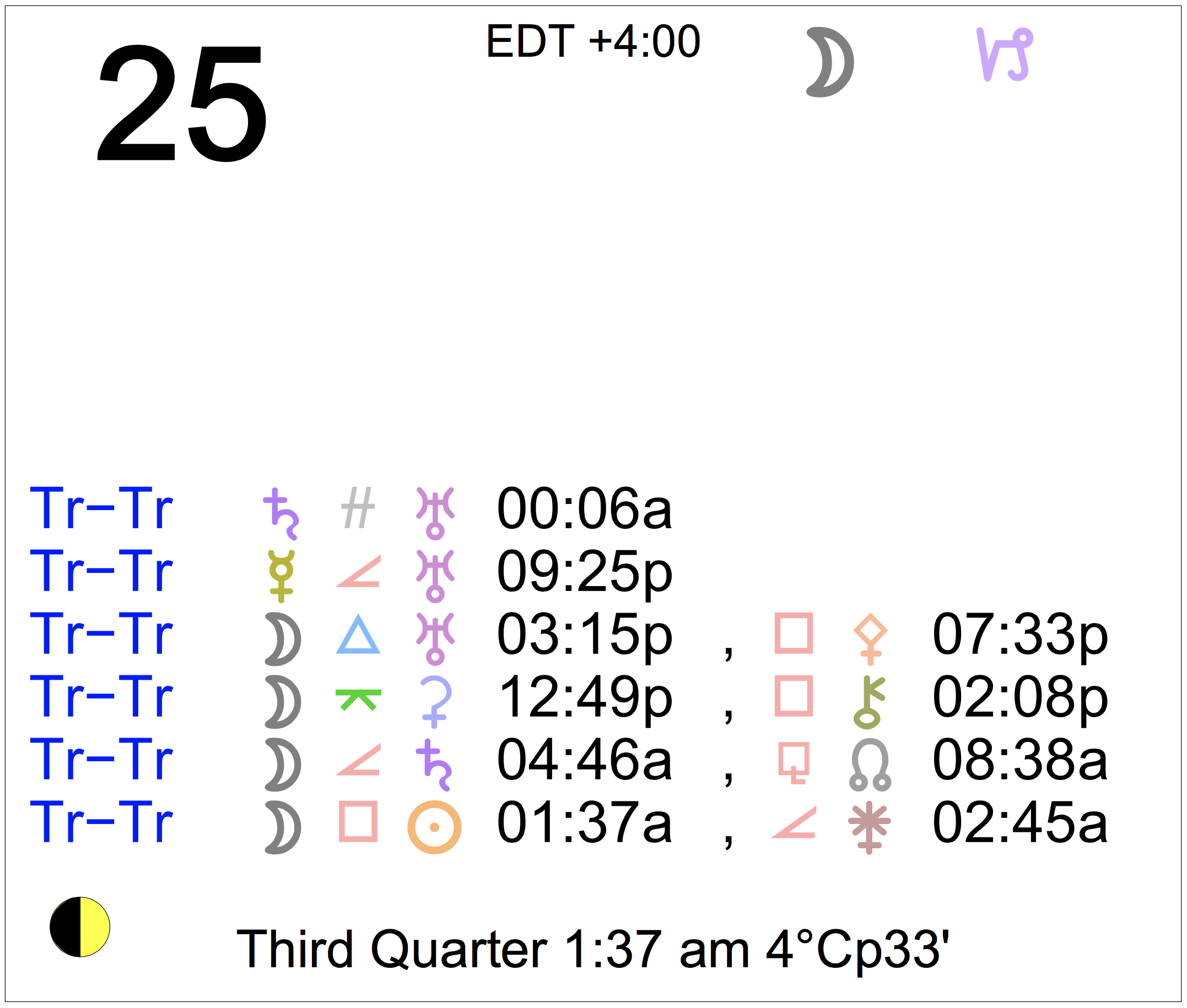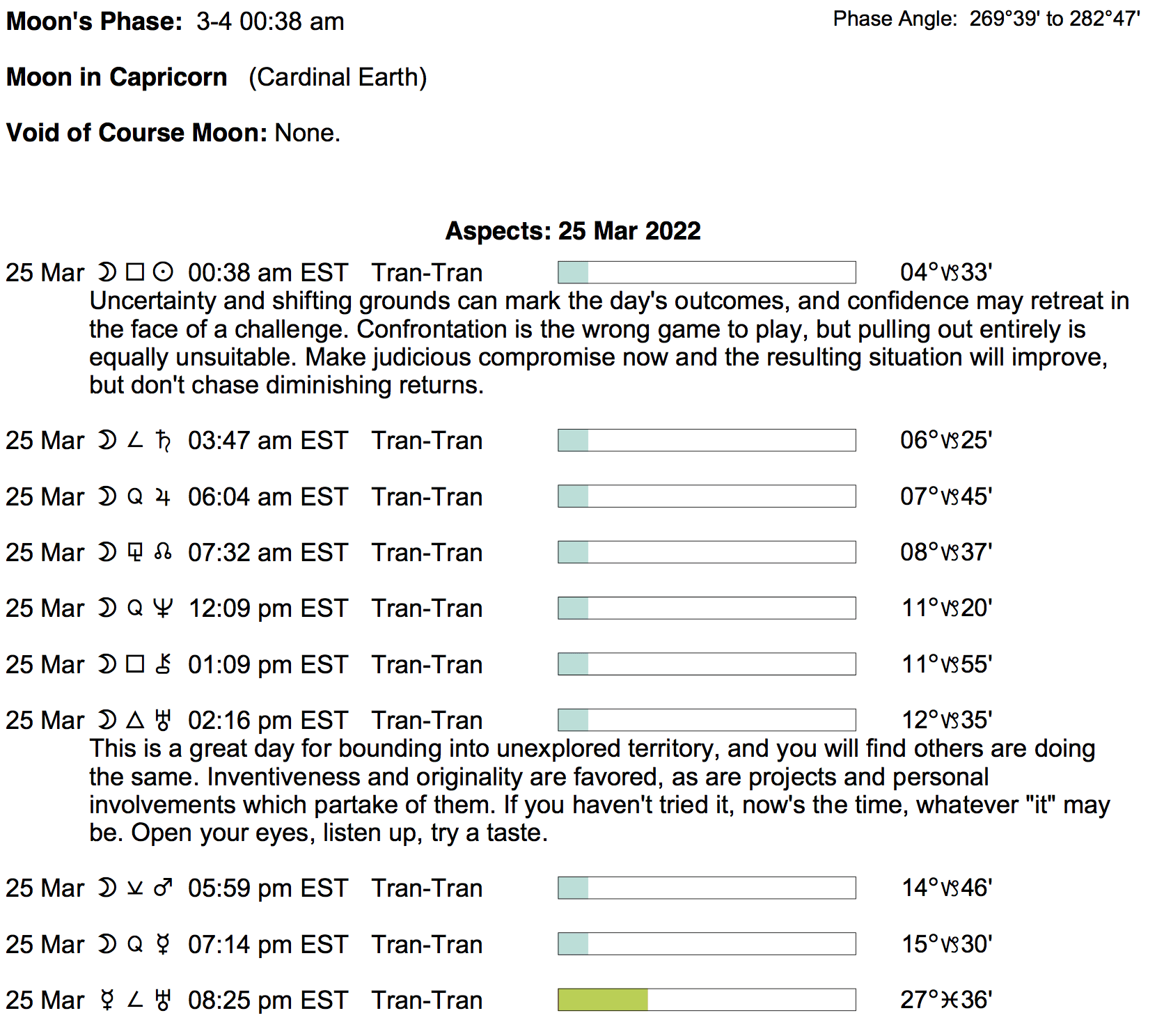 Planet Color Key: The longer the bar, the slower the aspecting planet, and the longer the duration of the planet’s transit.