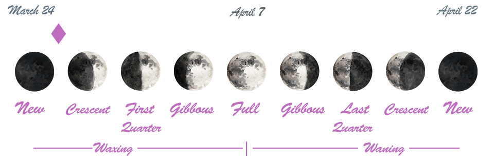 - The New Moon occurred on March 24th in Aries, and the First Quarter Moon will happen on April 1st.