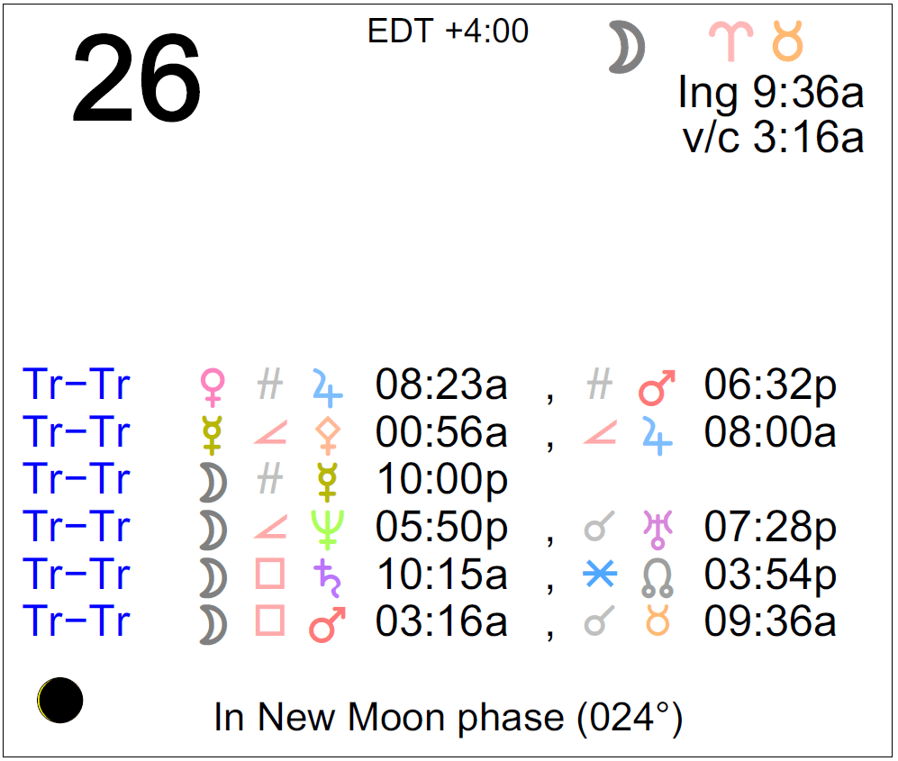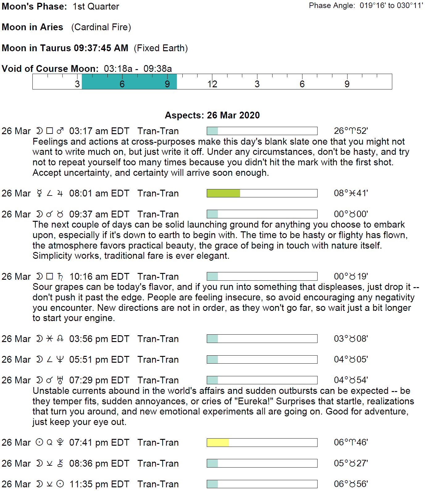 Planet Color Key: The longer the bar, the slower the aspecting planet and the longer the duration of the planet’s transit.