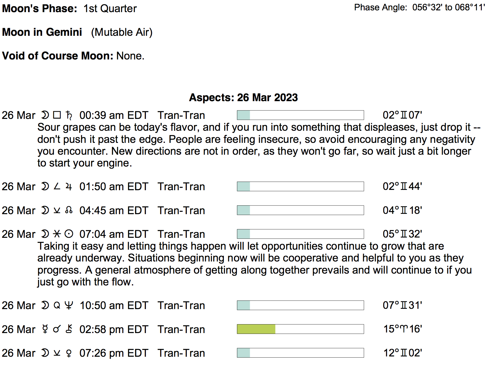 Planet Color Key: The longer the bar, the slower the aspecting planet, and the longer the duration of the planet’s transit.