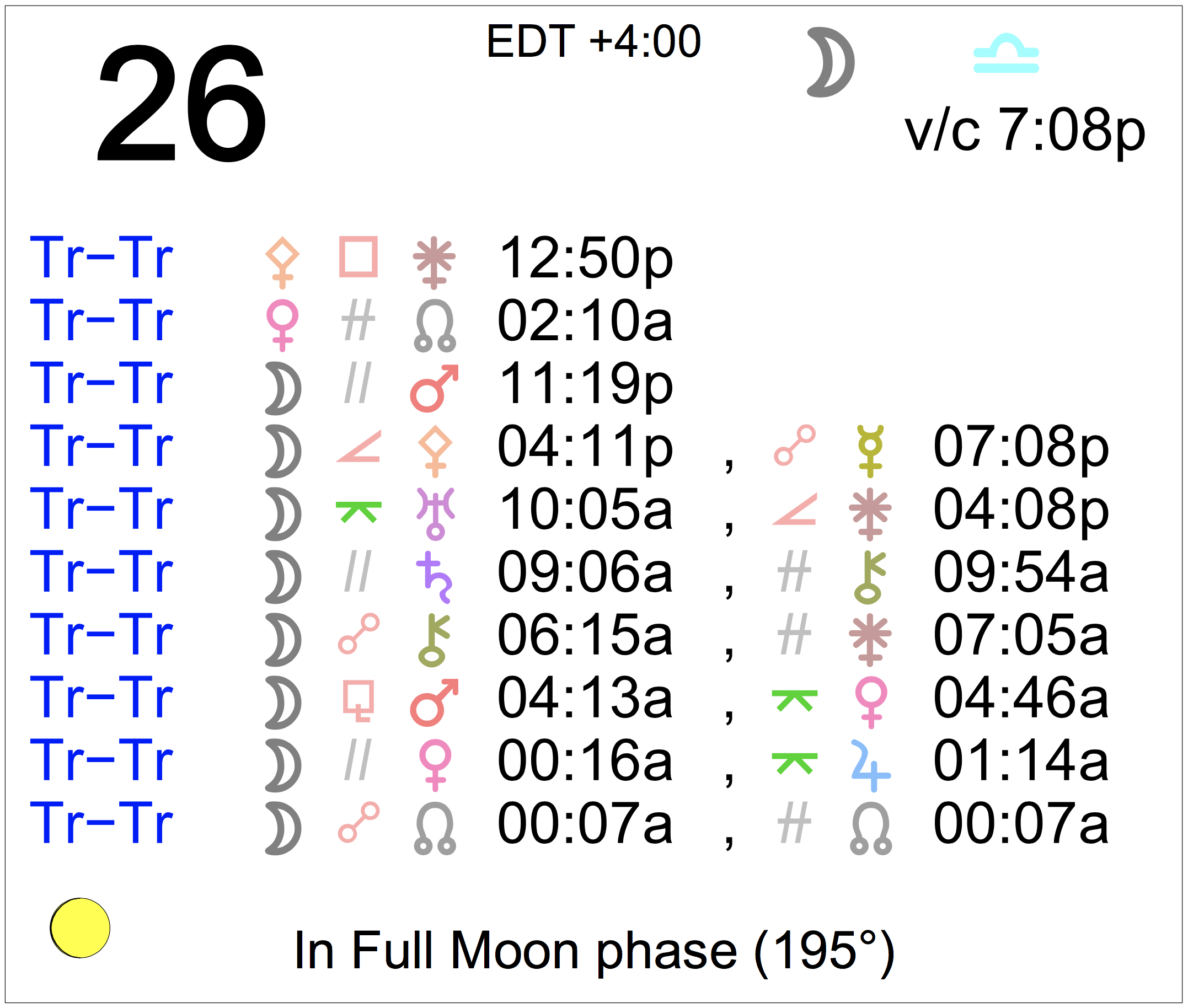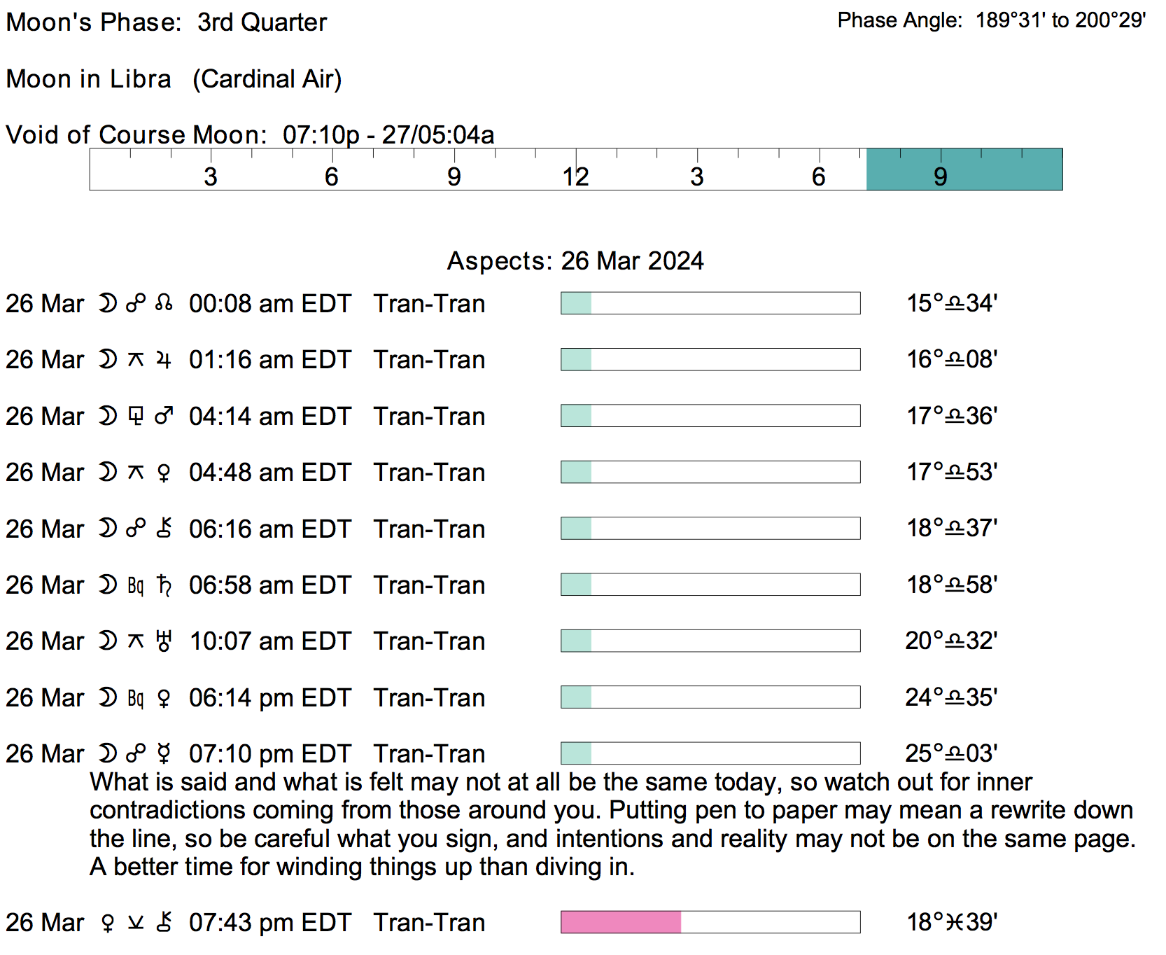 Planet Color Key: The longer the bar, the slower the aspecting planet, and the longer the duration of the planet’s transit.