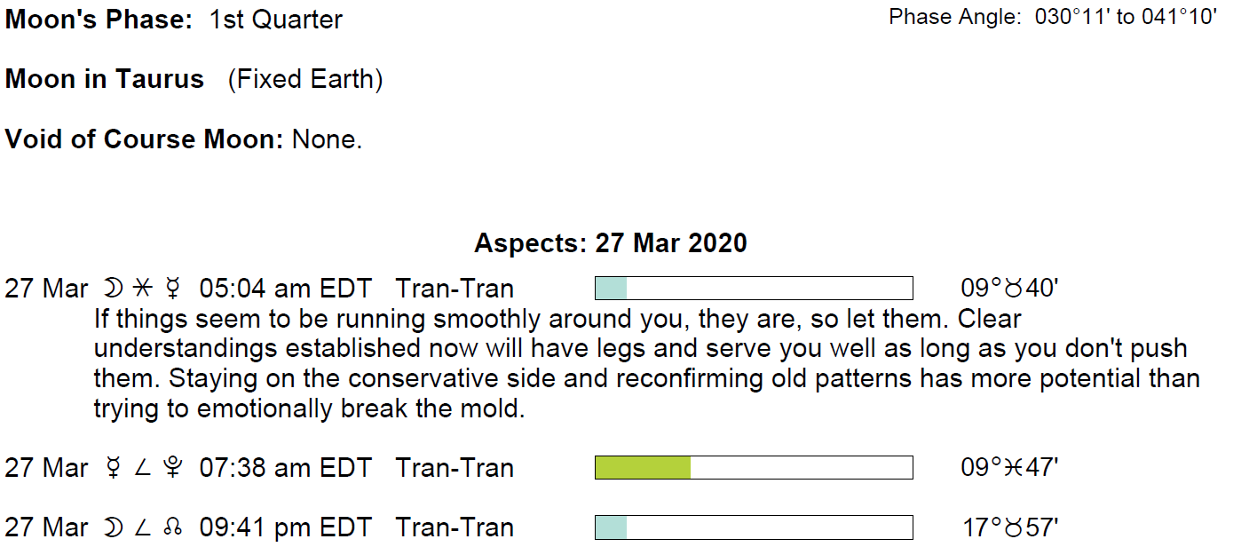 Planet Color Key: The longer the bar, the slower the aspecting planet and the longer the duration of the planet’s transit.