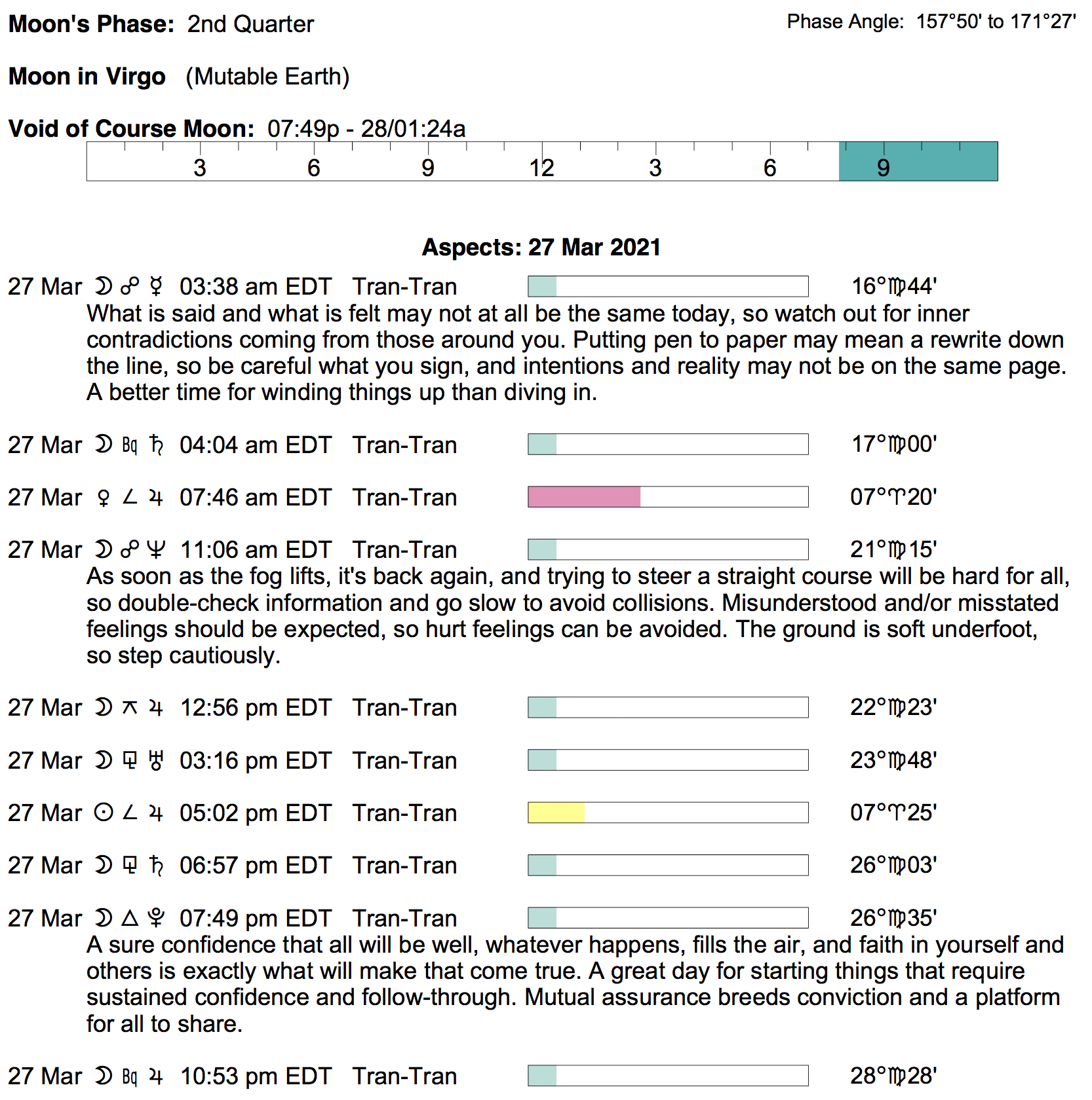 Planet Color Key: The longer the bar, the slower the aspecting planet, and the longer the duration of the planet’s transit.