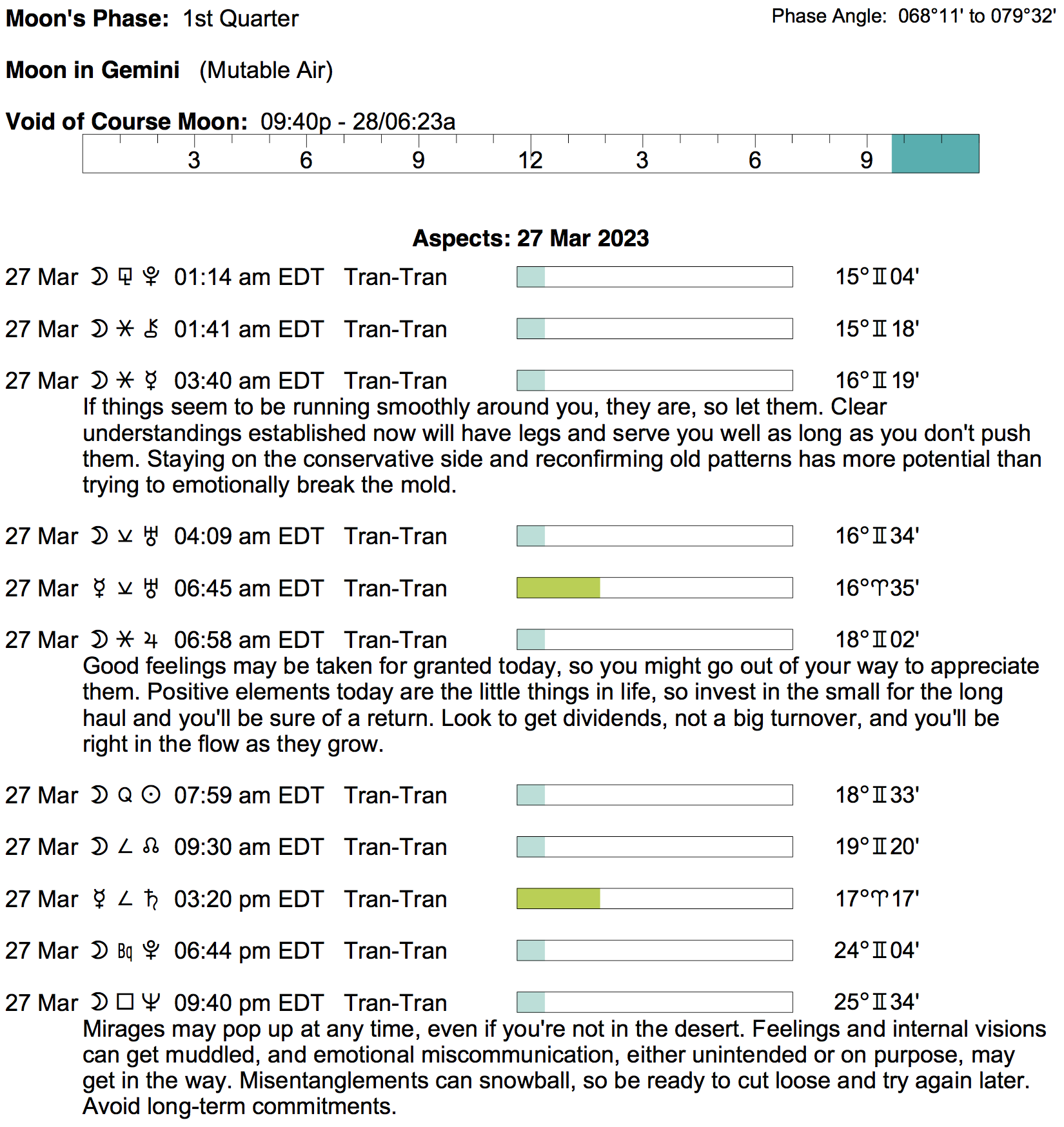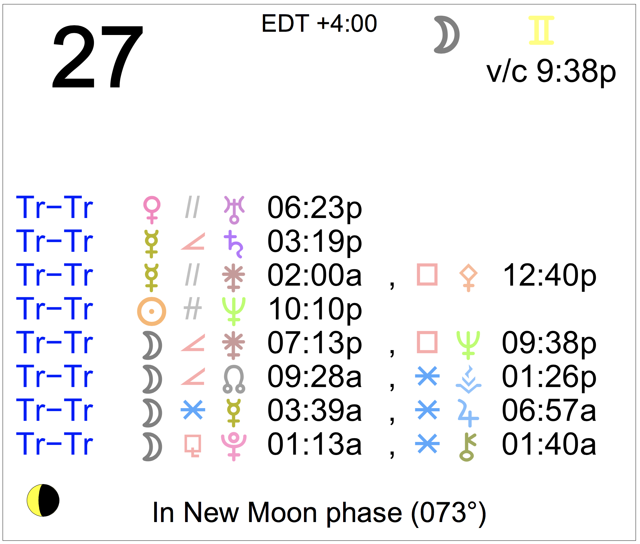 Planet Color Key: The longer the bar, the slower the aspecting planet, and the longer the duration of the planet’s transit.