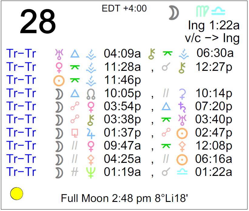 - The Full Moon occurs today in the sign of Libra at 2:47 PM.