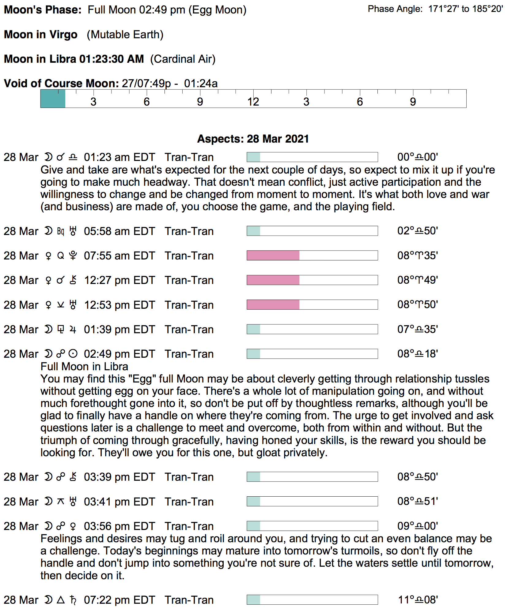 Planet Color Key: The longer the bar, the slower the aspecting planet, and the longer the duration of the planet’s transit.