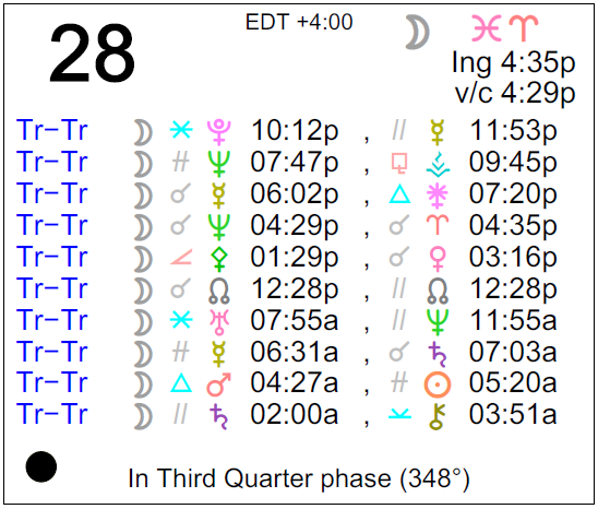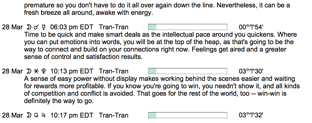 Planet Color Key: The longer the bar, the slower the aspecting planet, and the longer the duration of the planet’s transit.