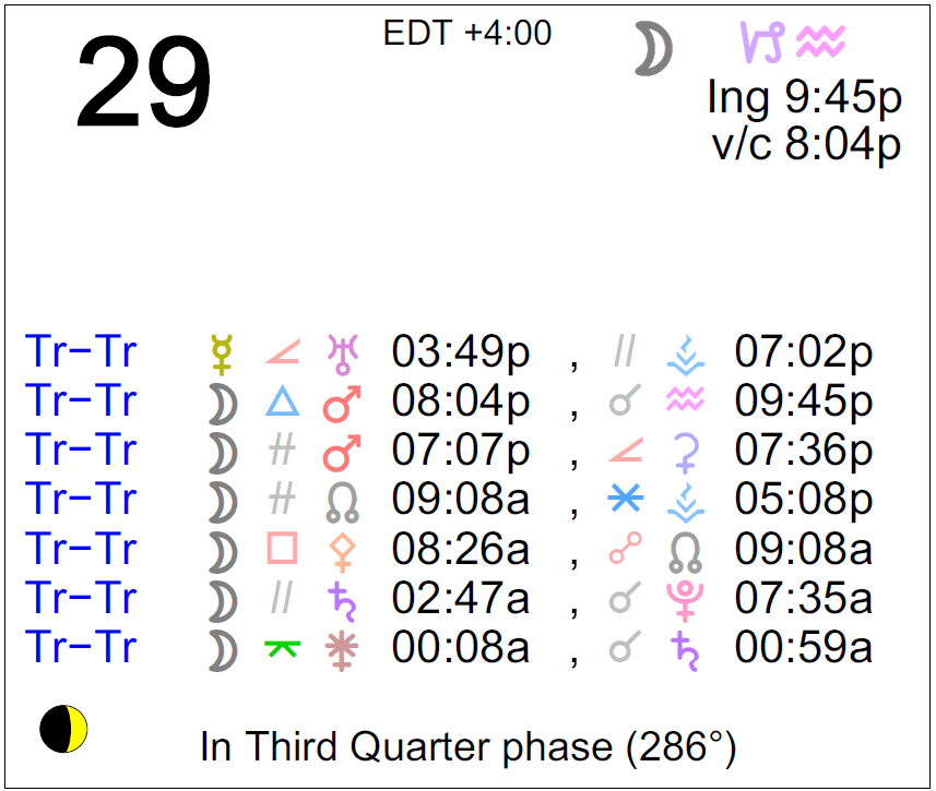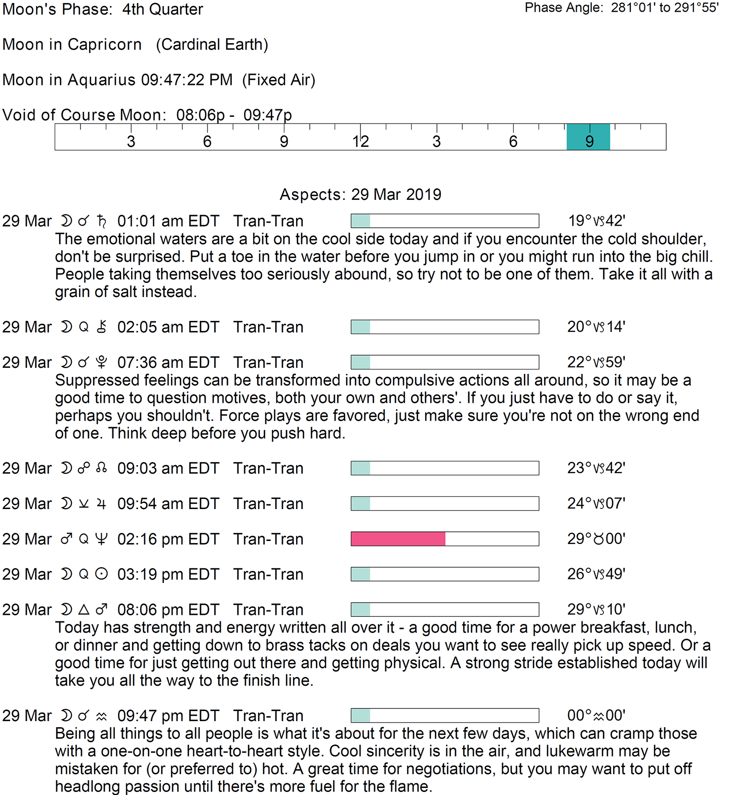Planet Color Key: The longer the bar, the slower the aspecting planet and the longer the duration of the planet’s transit.