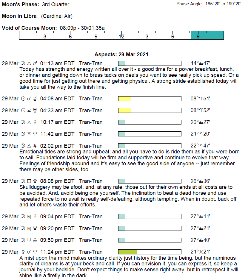 Planet Color Key: The longer the bar, the slower the aspecting planet, and the longer the duration of the planet’s transit.