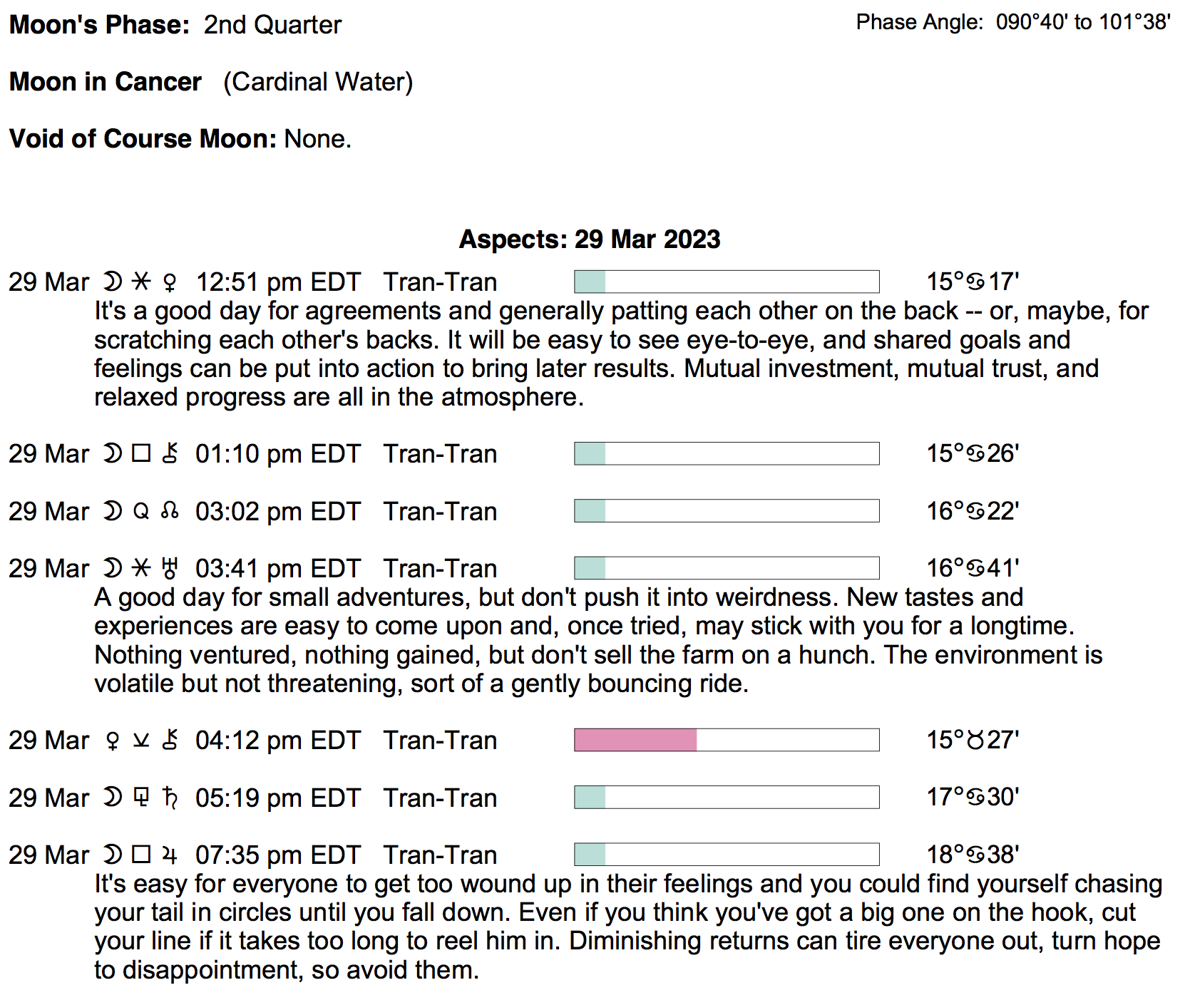Planet Color Key: The longer the bar, the slower the aspecting planet, and the longer the duration of the planet’s transit.