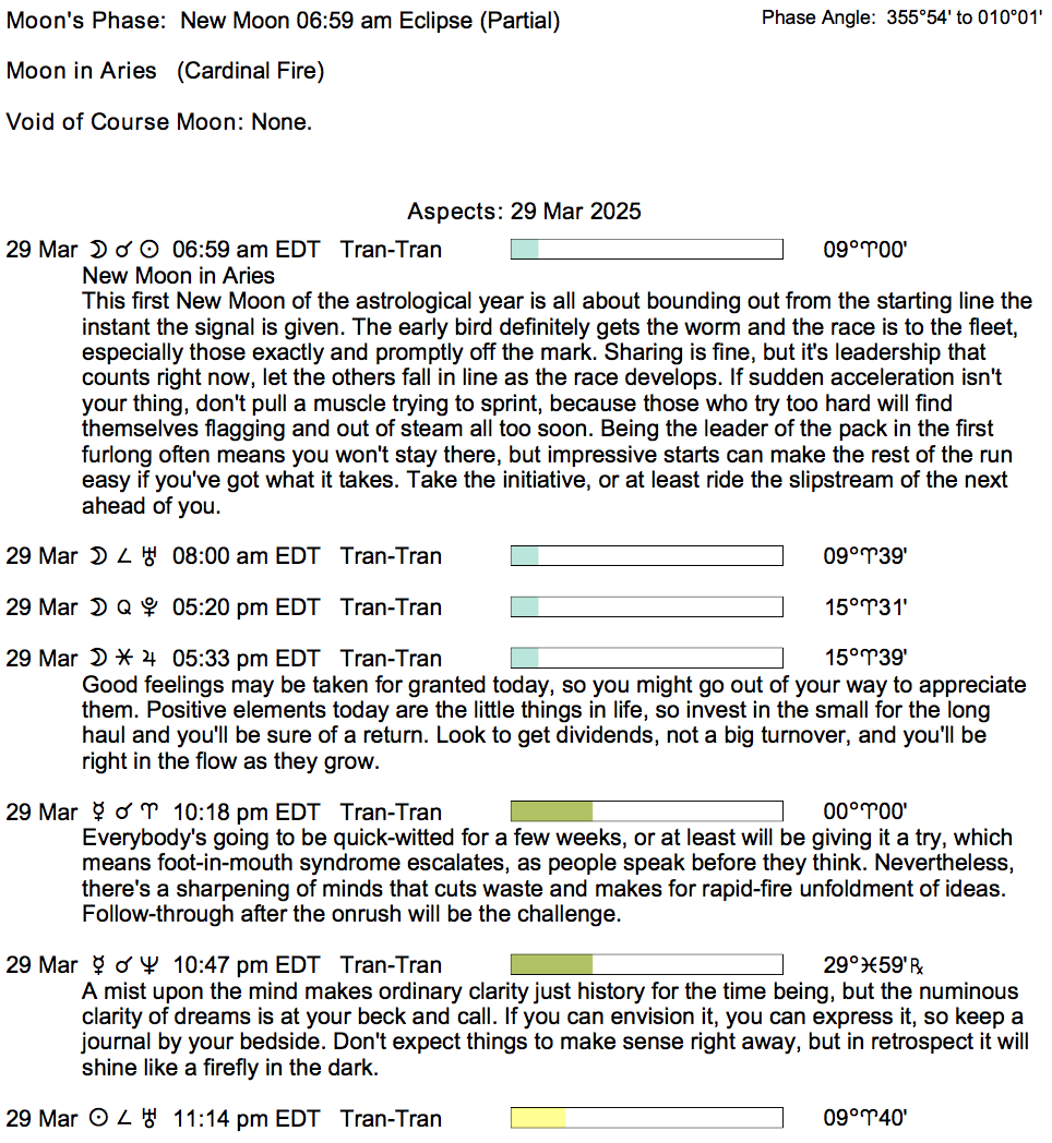 - The New Moon/Solar Eclipse occurs today at 6:57 AM EDT in the sign of Aries.