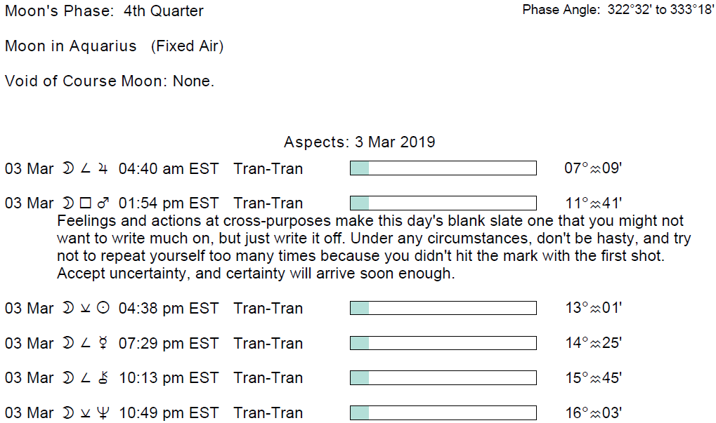 Planet Color Key: The longer the bar, the slower the aspecting planet and the longer the duration of the planet’s transit.