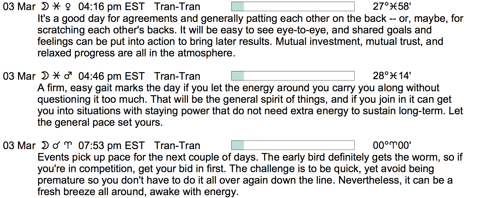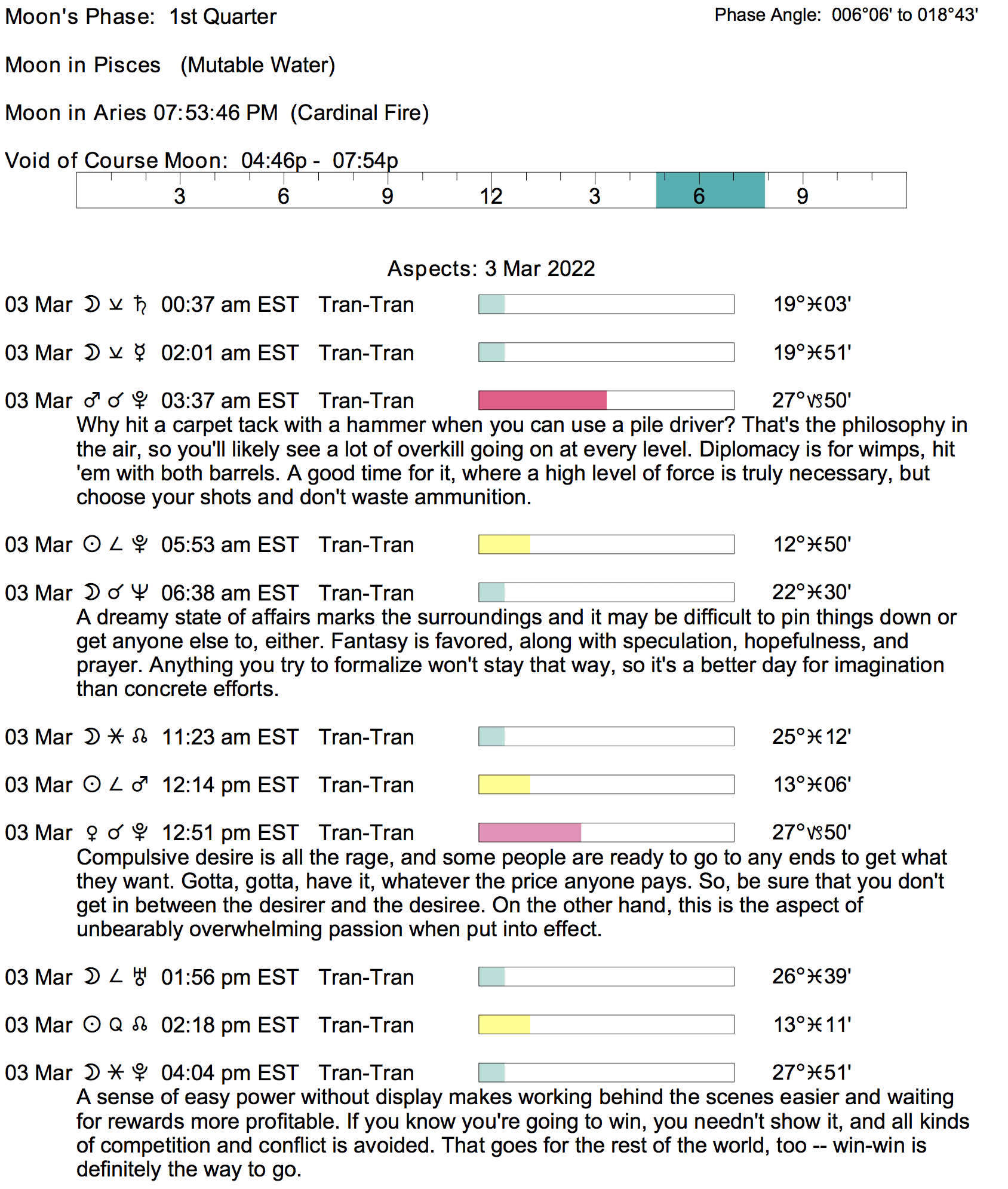 Planet Color Key: The longer the bar, the slower the aspecting planet, and the longer the duration of the planet’s transit.