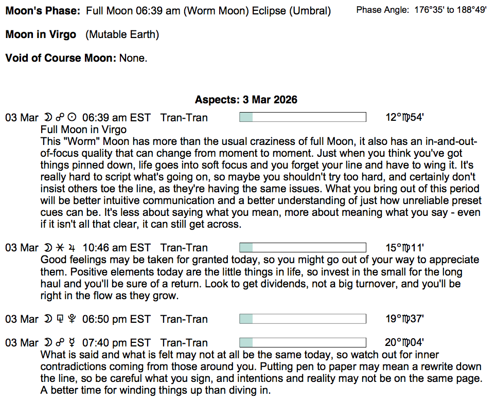 - The Full Moon Lunar Eclipse occurs today in the sign of Virgo at 6:37 AM.