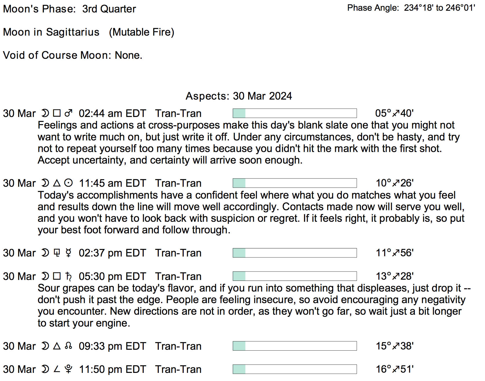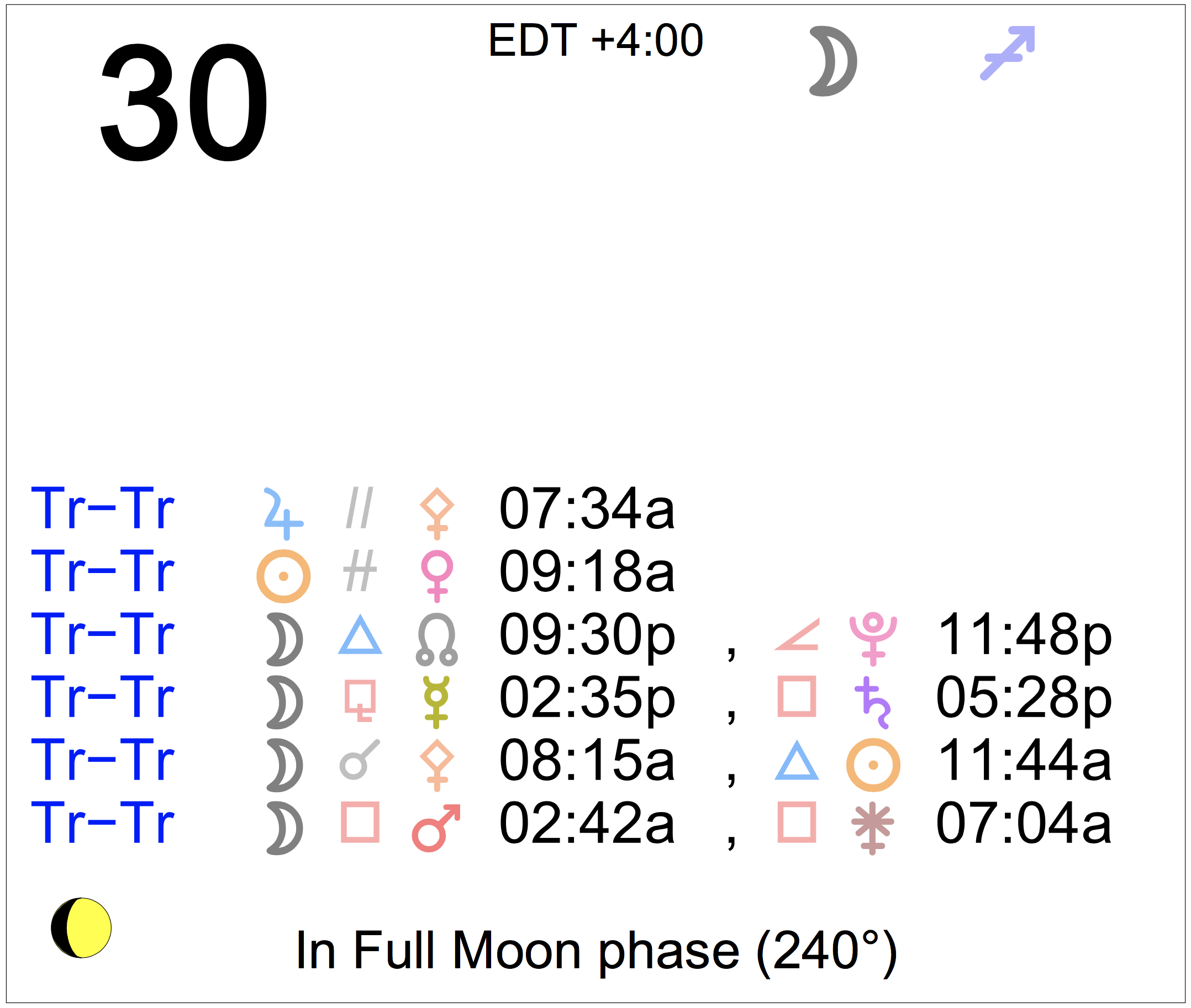 Planet Color Key: The longer the bar, the slower the aspecting planet, and the longer the duration of the planet’s transit.