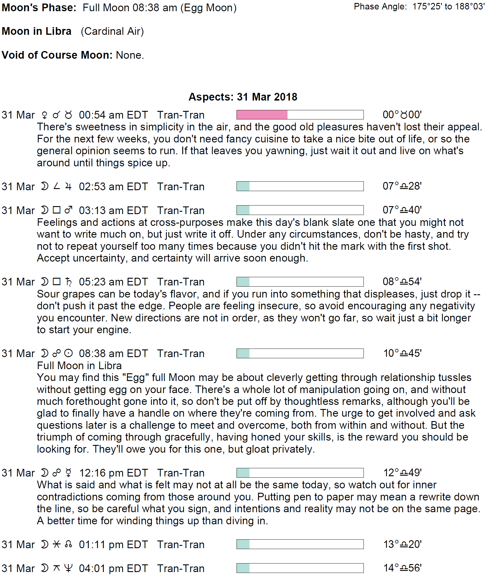 Planet Color Key: The longer the bar, the slower the aspecting planet and the longer the duration of the planet’s transit.