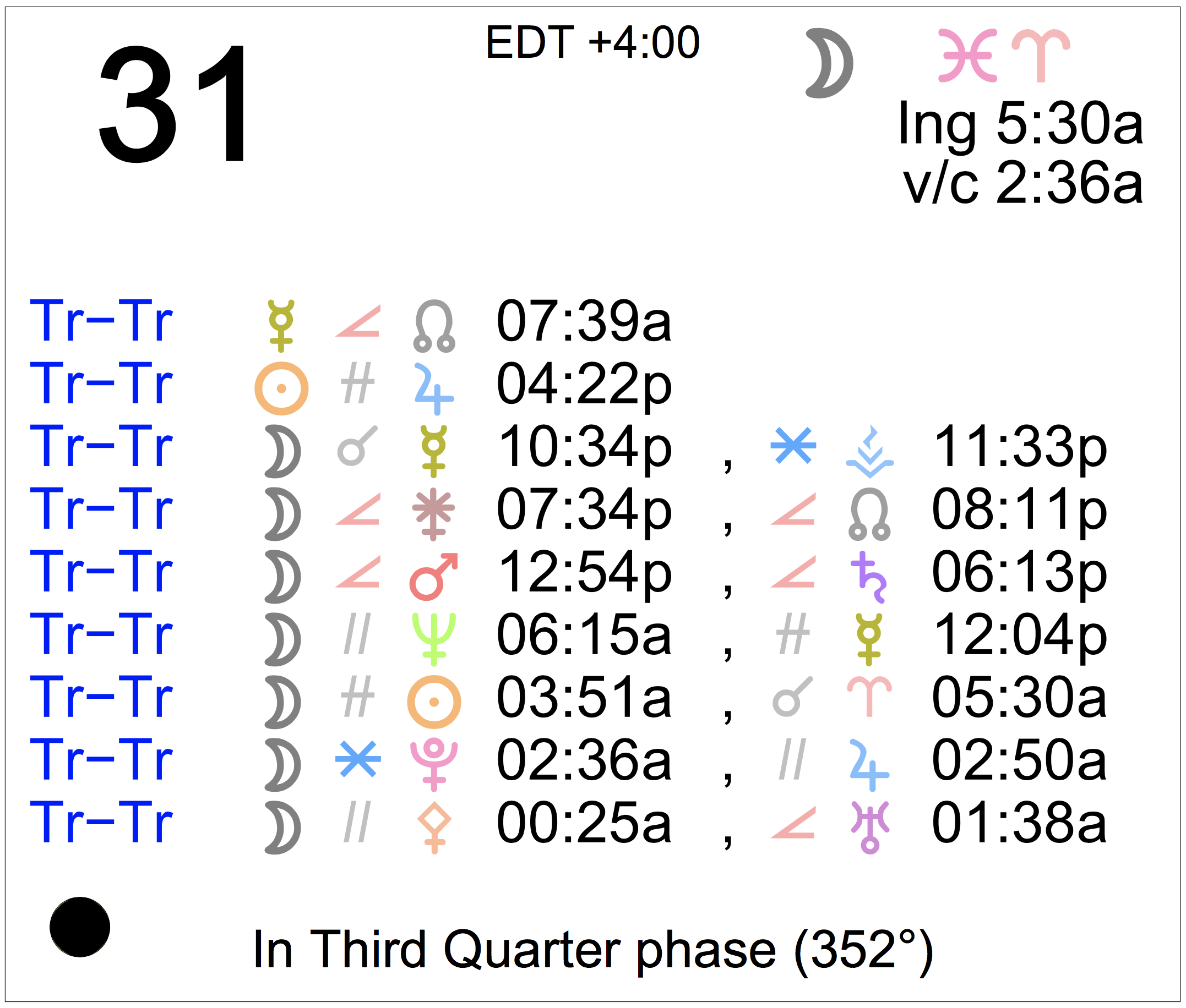 Planet Color Key: The longer the bar, the slower the aspecting planet, and the longer the duration of the planet’s transit.