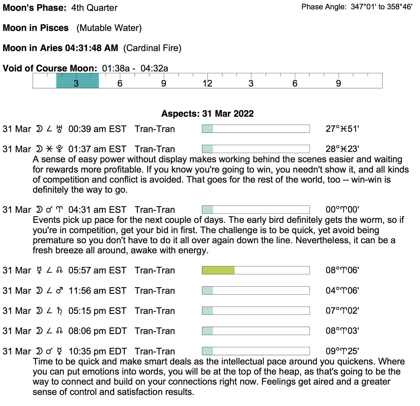 - The Moon is in Pisces until 5:30 AM, after which the Moon transits Aries.