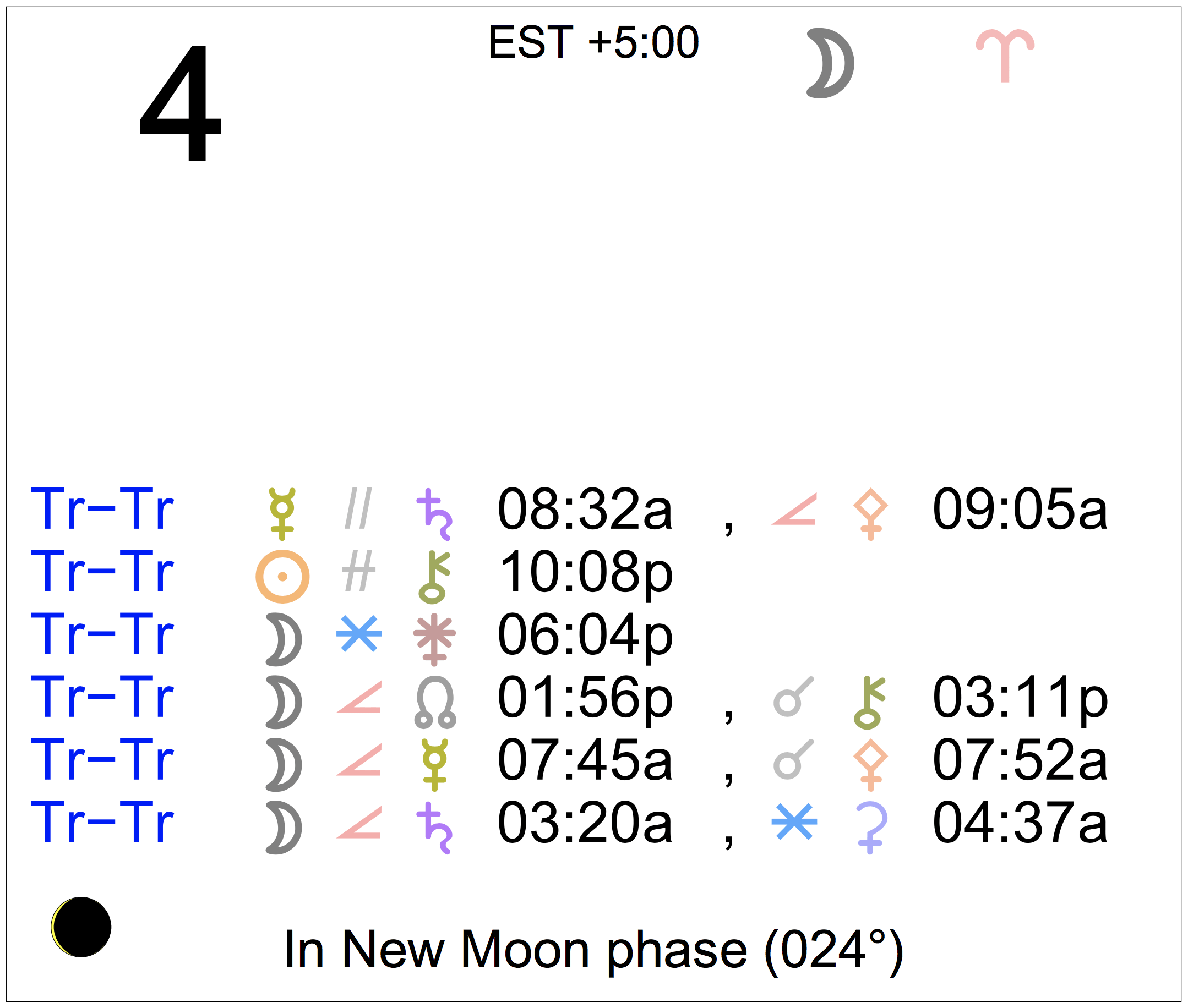 Planet Color Key: The longer the bar, the slower the aspecting planet, and the longer the duration of the planet’s transit.