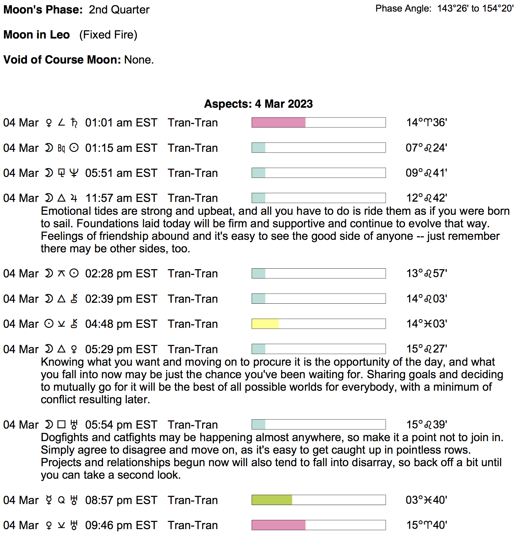 Planet Color Key: The longer the bar, the slower the aspecting planet, and the longer the duration of the planet’s transit.