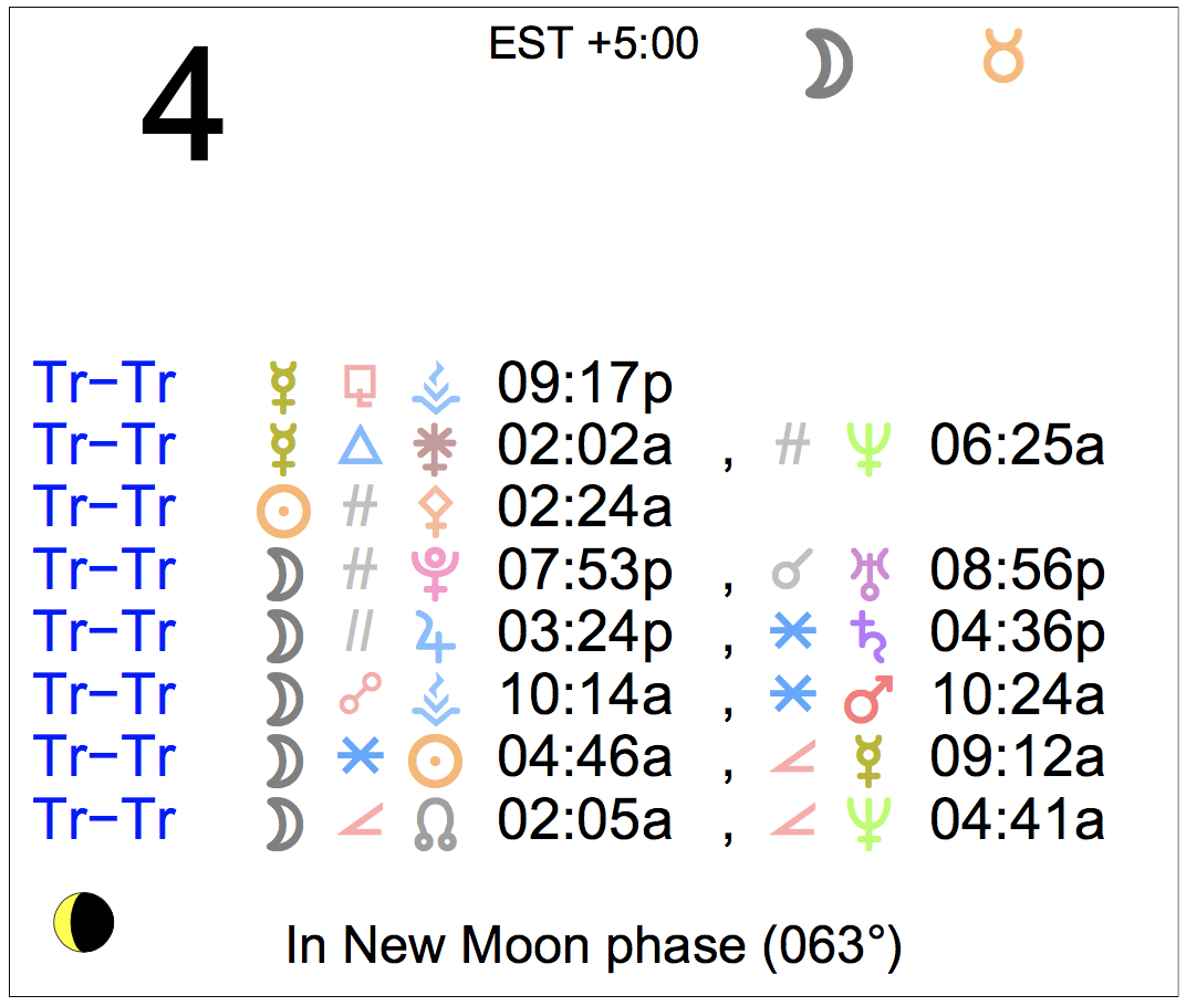 Planet Color Key: The longer the bar, the slower the aspecting planet, and the longer the duration of the planet’s transit.