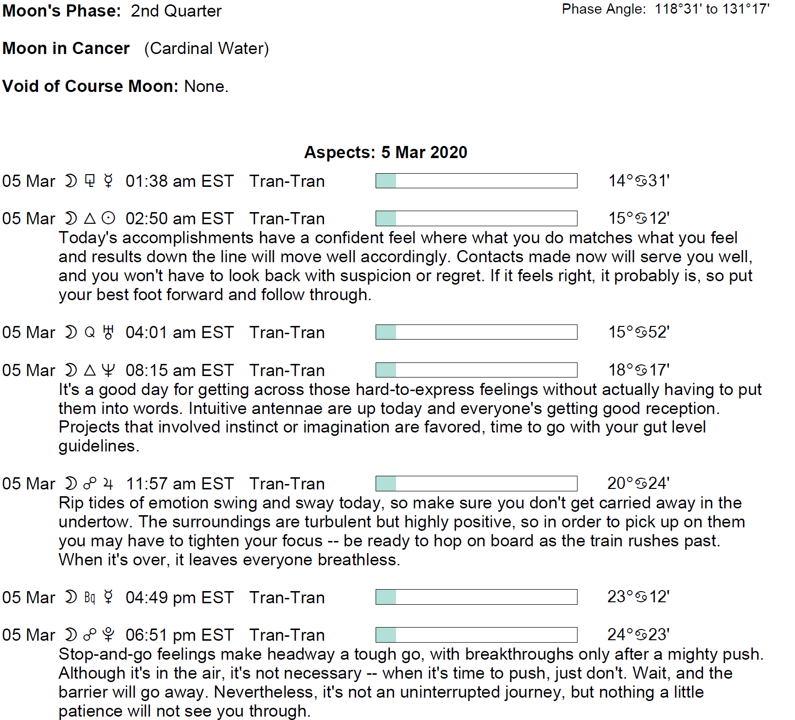 Planet Color Key: The longer the bar, the slower the aspecting planet and the longer the duration of the planet’s transit.