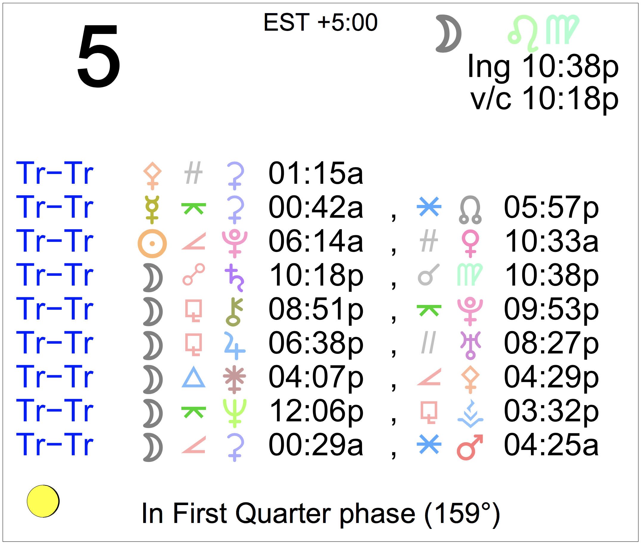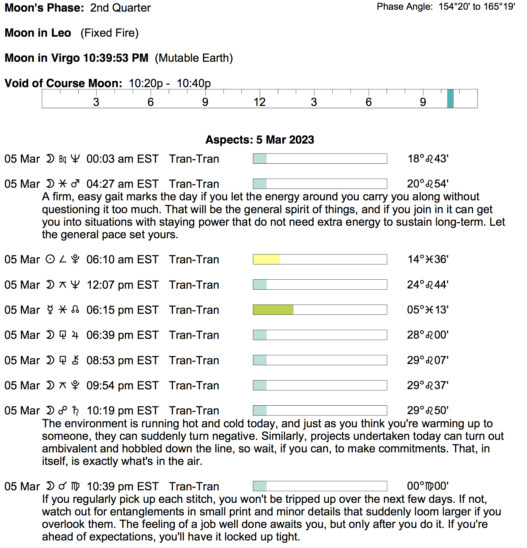 - A void Moon period occurs from 10:18 PM to 10:38 PM today.